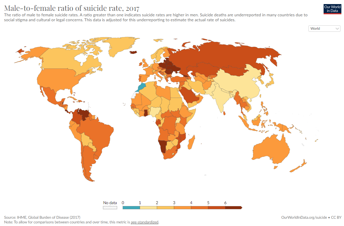 Pero uno de los hechos más llamativos es el importante sesgo de género que existe en el suicidio. Siete de cada diez personas que decide acabar con su vida son hombres, con tan solo un país en todo el mundo en los que la tasa de mujeres se acerca (Pakistán) y uno solo en el que la supera (Marruecos). En muchos otros países esta diferencia se dispara hasta los extremos de Ghana (10,5 hombres por cada mujer), Namibia (7,6), Venezuela (7,5), Polonia (7,4) o Ucrania (7,1).