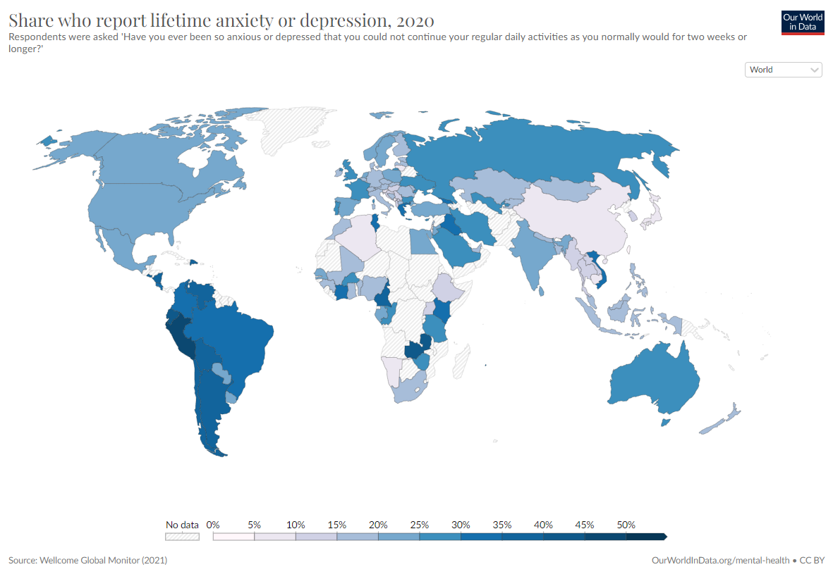 En 2021, Wellcome Global Monitor (WGM) publicó un informe en el que indagaba en este problema y aportaba algunos datos interesantes. Quizá el más llamativo e importante es el poder incapacitante del trastorno de ansiedad y la depresión. No estamos hablando de gente que está nerviosa o triste, estamos hablando de gente que no puede seguir con su día a día de forma normal durante periodos prolongados. En el estudio, que se realizó con 119.000 individuos de 113 países, se incluye una pregunta que intenta responder a esa cuestión: ¿Has tenido alguna vez ansiedad o depresión de tal modo que no puedes continuar con tus actividades diarias con normalidad por dos semanas o más?