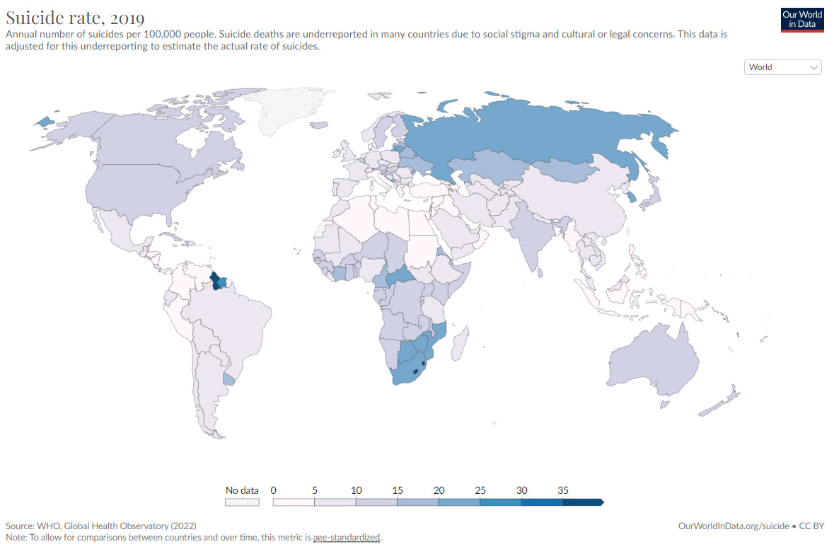 Las diferencias regionales en las tasas de suicidio reportadas por la OMS son llamativas, pero sin ninguna correlación aparente con el mapa previo sobre enfermedades mentales. En este caso destaca el sur de África, los países de la Antigua Unión Soviética y las Guayanas: Lesoto (87,5 %), Esuatini (40,5 %), Guyana (40,9 %), Surinam (25,9 %), Rusia (21,6 %), Lituania (20,2 %).