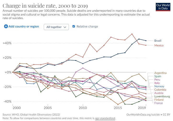 El pasado domingo 10 de septiembre se celebró el Día Mundial para la Prevención del Suicidio. Según datos de la OMS, se estima que cada año 10 de cada 100.000 personas decide acabar con su propia vida. La cifra es abrumadora, pero, a pesar de lo que pudiera parecer de forma intuitiva, es una cifra que está en descenso en casi la totalidad de países. La mejora en las condiciones de vida han ayudado en parte, aunque también ha sido importante dar visibilidad al problema y las políticas públicas. Lamentablemente, hay dos excepciones en México y Brasil, donde el número de suicidios ha aumentado de forma significativa en las últimas dos décadas.