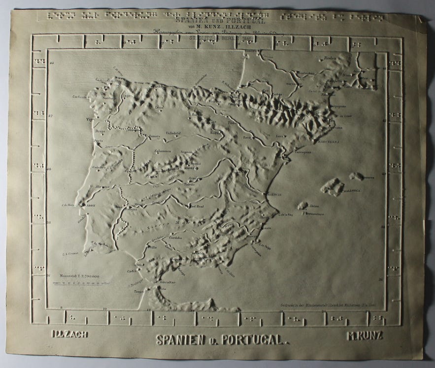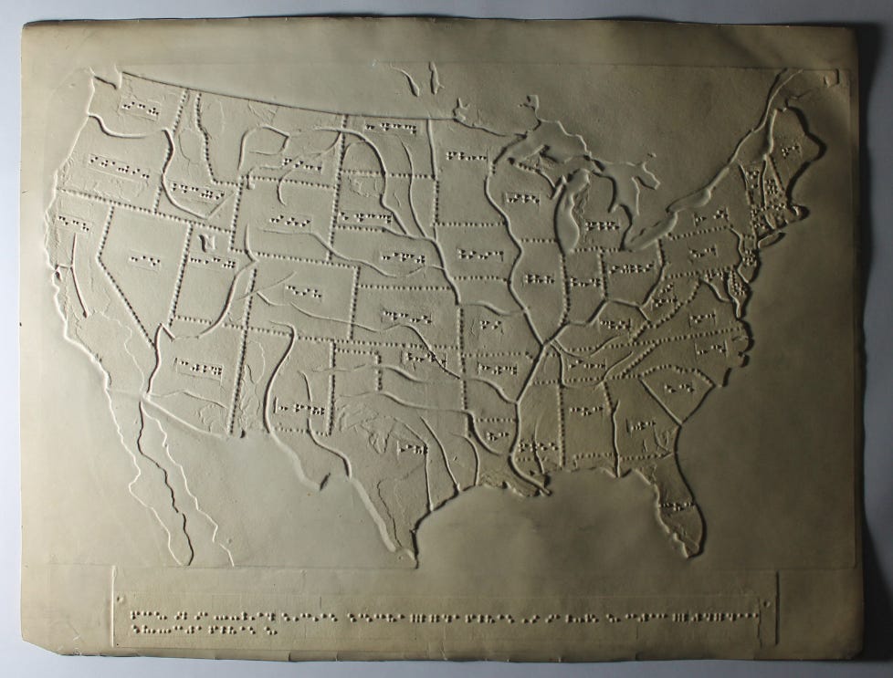 Los mapas para ciegos también comenzaron a introducir poco a poco cambios gracias al Braille. Inicialmente sólo eran pequeños detalles en mapas a relieve para recalcar la intención y contexto del mapa, como este mapa de Norteamérica publicado en Río de Janeiro en 1858. Llevó algo varias décadas el comenzar a introducir el Braille para etiquetar países, ciudades o accidentes geográficos, pero a comienzos del siglo XX ya se había convertido en la norma.