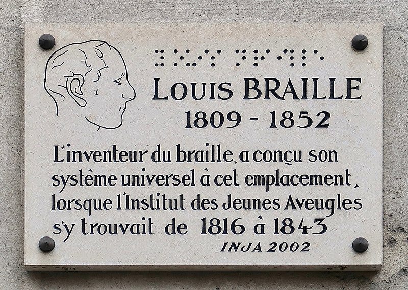 Luis Braille nació en 1809 y, a los tres años, por una infección, perdió la vista en los dos ojos. A pesar de ello, destacó en sus estudios rudimentarios, gracias a lo que pudo conseguir una beca para continuar su educación a los 10 años en L'Institution Nationale des Jeunes Aveugles. Un año después de entrar en la escuela, accedió a la presentación de Barbier y quedó fascinado por su planteamiento de sistema de escritura.