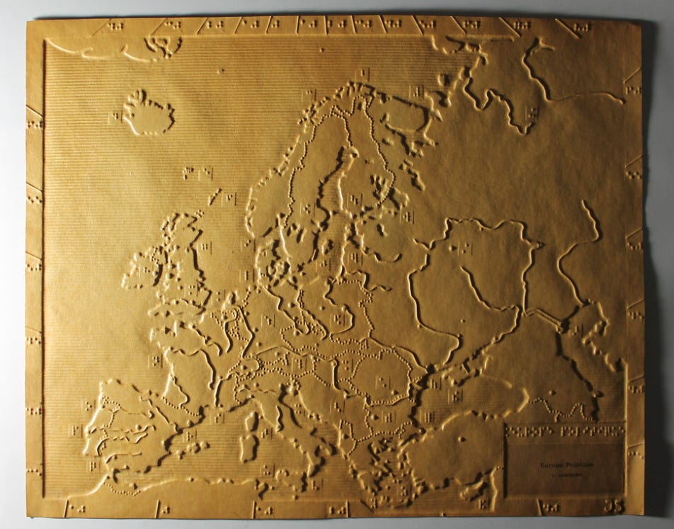 Uno de los mapas más fascinantes y, precisamente el que me llevó a escribir esta serie de artículos sobre cartografía para ciegos, es esta representación de Europa en 1915, justo tras el estallido de la Primera Guerra Mundial. Se desconoce prácticamente todo sobre el mapa, más allá de que se conserva esta imagen del mismo en la colección fotográfica de Bain News Service. Por la disposición de las fronteras y la referencia a la guerra en Europa, parece apropiado estimar que el mapa está datado en 1915.