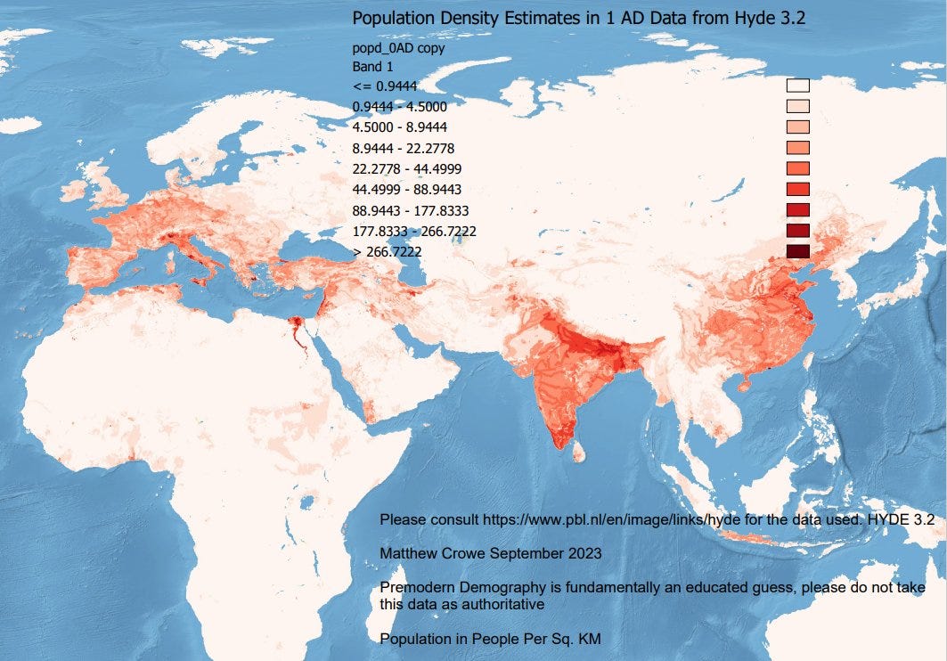 En el año 1 ya no existe tanto consenso. El Population Reference Bureau4 estima una población de 300 millones de habitantes, partiendo de la hipótesis de que el Imperio Romano tenía una población de unos 40 ó 50 millones y que Asia era ya entonces la zona más poblada del mundo. Las estimaciones de otras fuentes varían desde los 170 millones de habitantes hasta más de 500 millones.