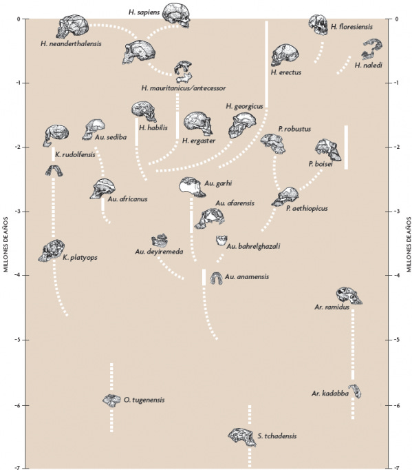 Los registros arqueológicos y paleontológicos nos han permitido conocer una gran cantidad de especies de homínidos que poblaron la Tierra antes que nosotros. Como bien es sabido, algunos de estos homínidos pueden considerarse antepasados directos de nosotros, pero una gran mayoría pertenecen a ramas hoy extintas.