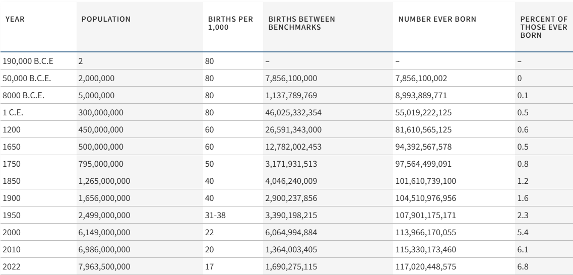 Estas estimaciones que os presento fueron realizadas por Carl Haub7, trabajador del Population Reference Bureau. Según ellas, en el año 2022, en la Tierra ya habían nacido más de 117.000 millones de personas. O lo que es lo mismo: En la actualidad viven en la Tierra casi un 7 % de las personas que alguna vez han estado vivas.