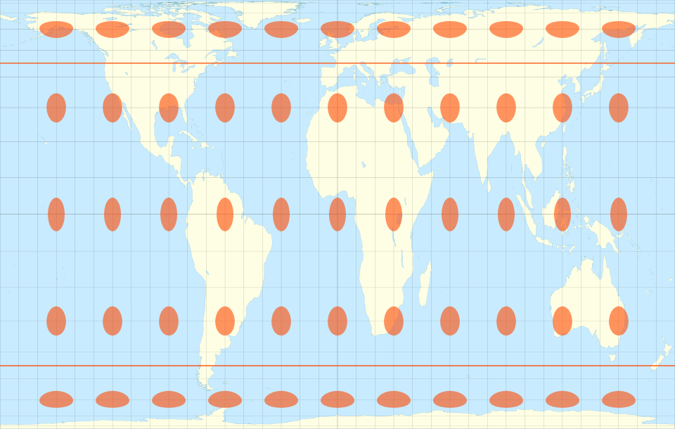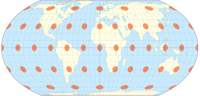 Además de esa gran relevación de la cartografía, también formalizó matemáticamente otras siete proyecciones cartográficas, tres de ellas conformes y cuatro equivalentes6. Entre las equivalentes, me ha parecido oportuno quedarme con la proyección cilíndrica equivalente que podéis ver más arriba7. Observando los círculos, se puede ver cómo el área de los mismos se mantiene constante al margen de la latitud, pero la forma queda totalmente destrozada cuando nos acercamos a los polos.