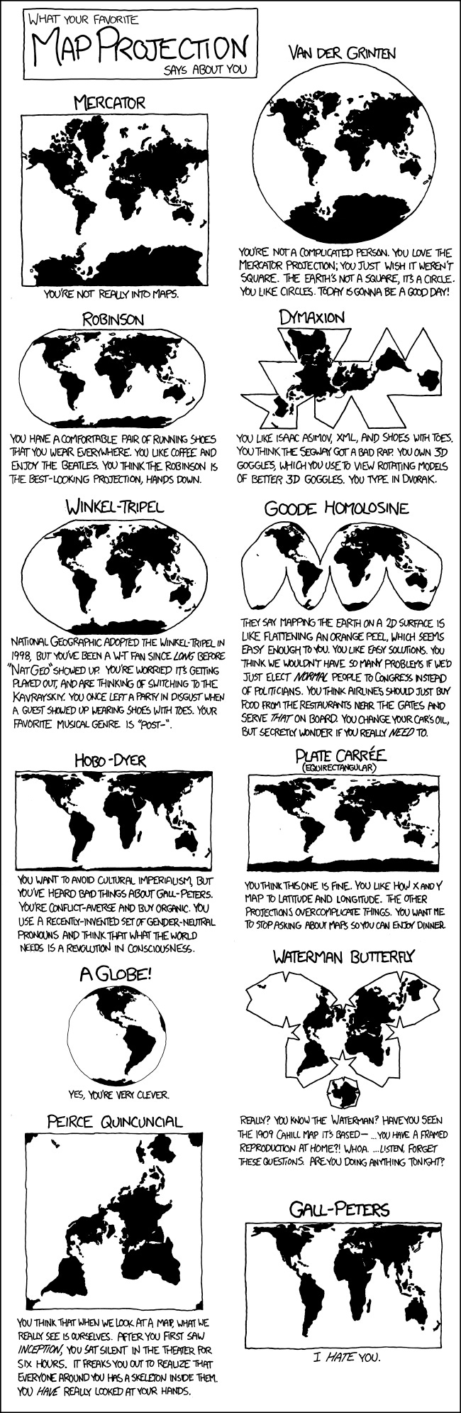 Pero, quizá, la crítica que me parece más irónica de todas es la que se centra por completo en la proyección elegida por Peters. De todas las proyecciones equivalentes que podría haber robado diseñado, se quedó precisamente con una de las pocas que, deforma notablemente todo el mapa, a excepción de Europa, Norteamérica y la parte central de Asia. Precisamente las mismas regiones a las que acusaba de colonialismo y visión eurocentrista.