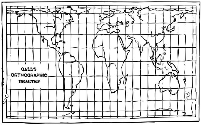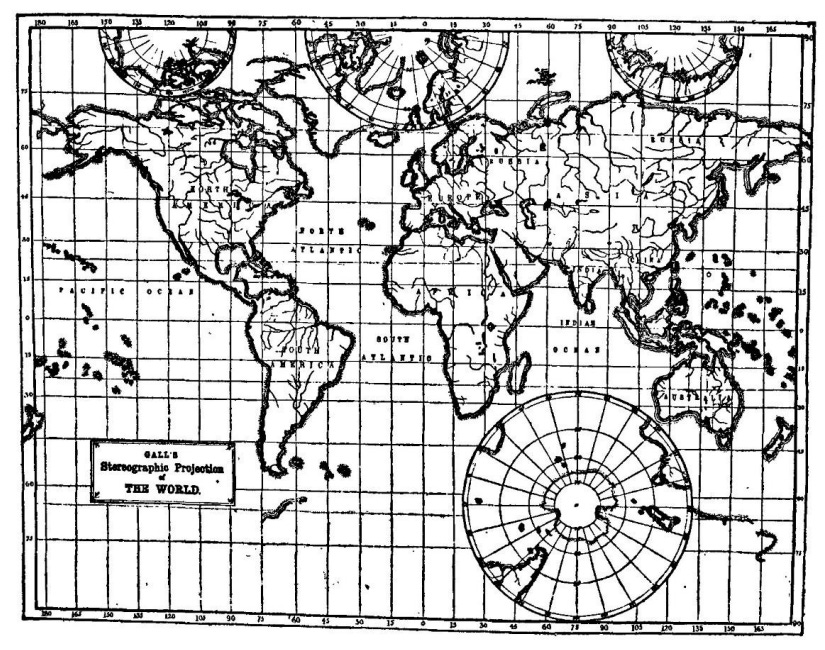 Posiblemente, el primero en criticar de frontalmente el uso de la proyección de Mercator en el contexto educativo fue James Gall. A pesar de dedicar su vida principalmente al ámbito religioso, también hizo sus pinitos en el campo de la cartografía, con la definición de tres nuevas proyecciones cartográficas en 1855. Para una de ellas, partió de la proyección cilíndrica equivalente de Lambert y la realizó algunas modificaciones para asegurarse que los paralelos mantenían una distancia constante entre sí, con una variación a partir de los paralelos 45° norte y 45° sur.