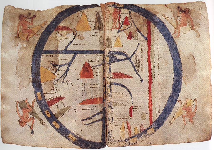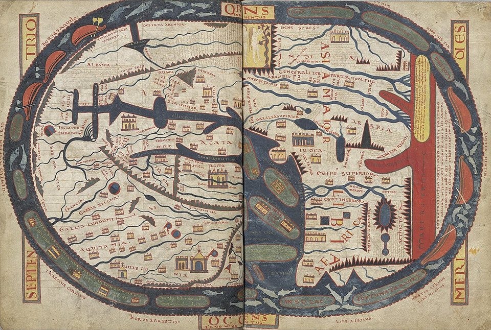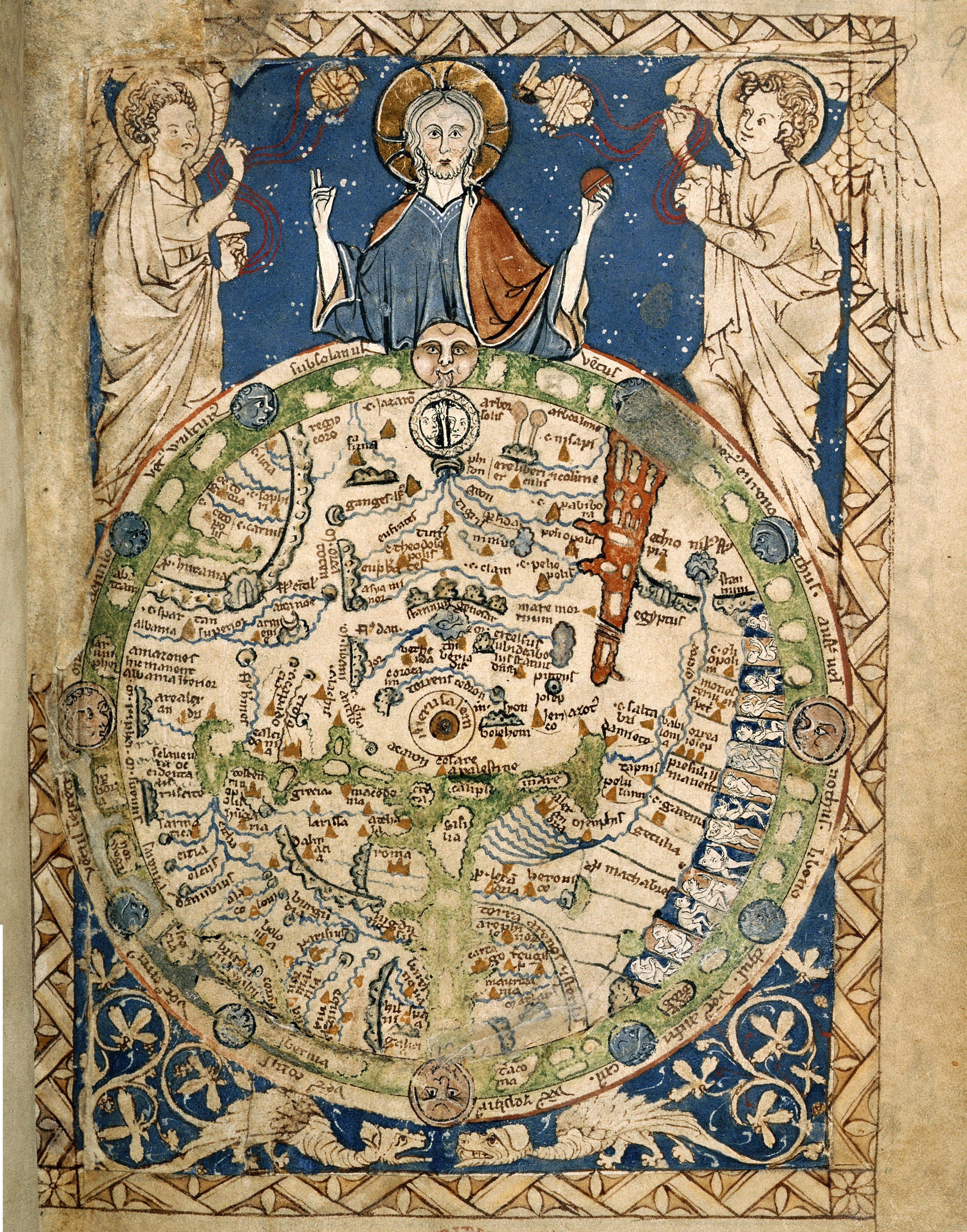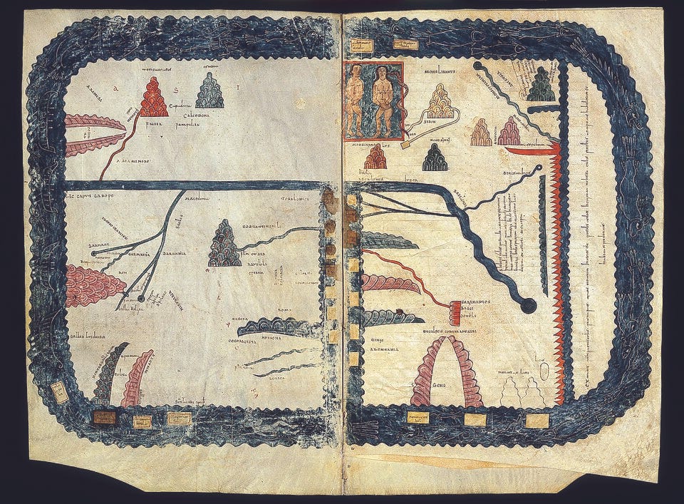 La comprensión del mundo cristiana, comenzó a quedar plasmada en mapas durante la Edad Media, con los reconocidos mapas de T en O5. El primero en realizar un mapa de este tipo fue Isidoro de Sevilla en su libro Etimologías, que vio la luz en torno al año 630. Se trataba de la forma más simple de este tipo de mapa, con el mundo dividido en tres regiones. Asia en la parte superior, Europa en la parte inferior izquierda y África en la parte inferior derecha. En aquel mapa, no había ni rastro del Edén.