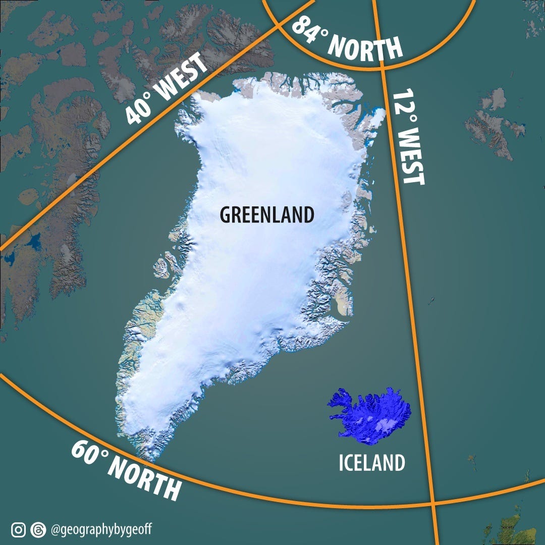 Intuitivamente, cualquiera diría rápidamente que Islandia está al este de Groenlandia, pero si miras cualquier mapa, pronto te percatarás de que Groenlandia no está solo más al norte y más al oeste que Islandia, sino que también está más al este y más al sur. De alguna forma, se puede decir que Groenlandia encierra a Islandia, aunque solo sea con puntos cardinales más extremos.