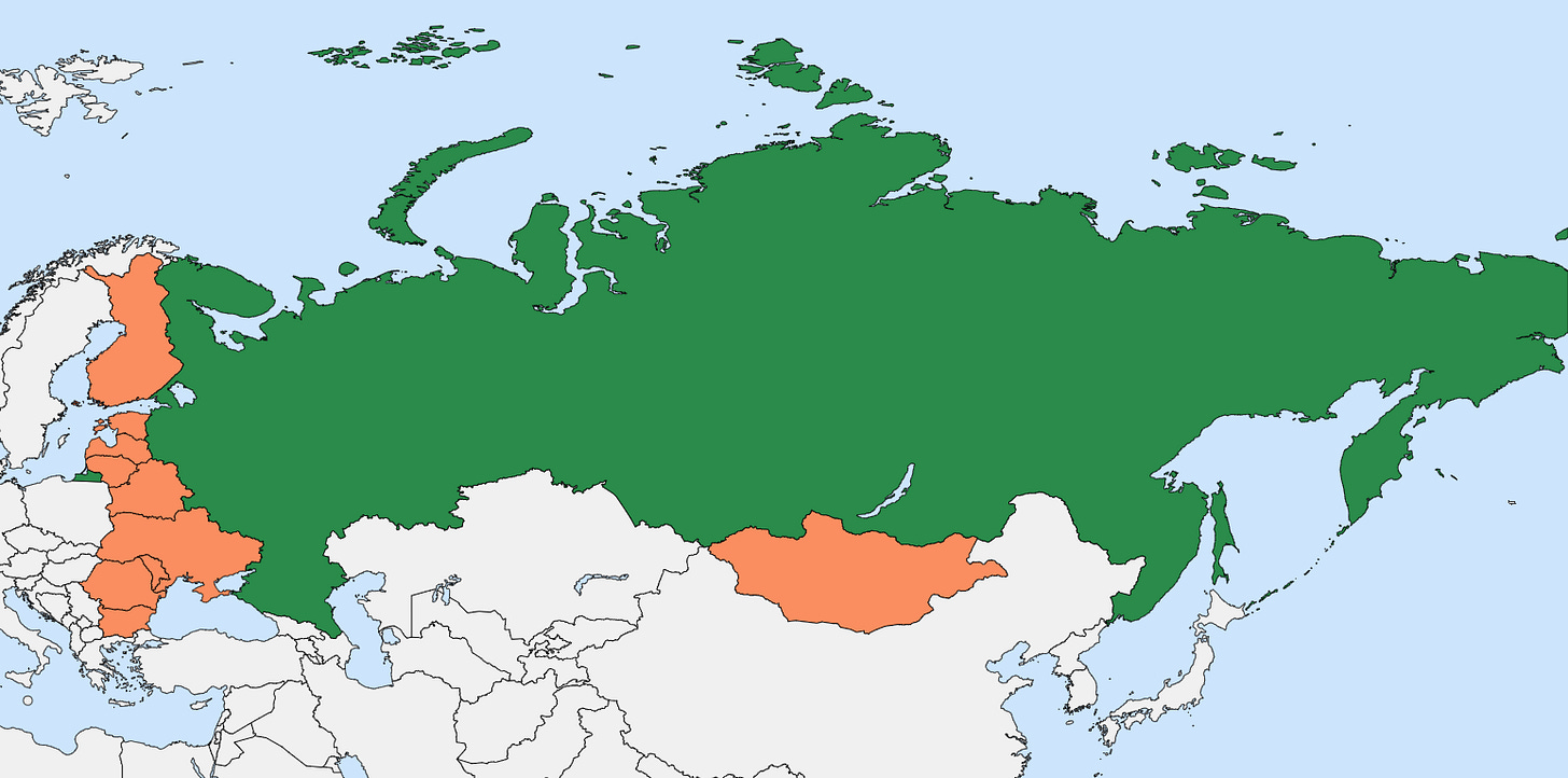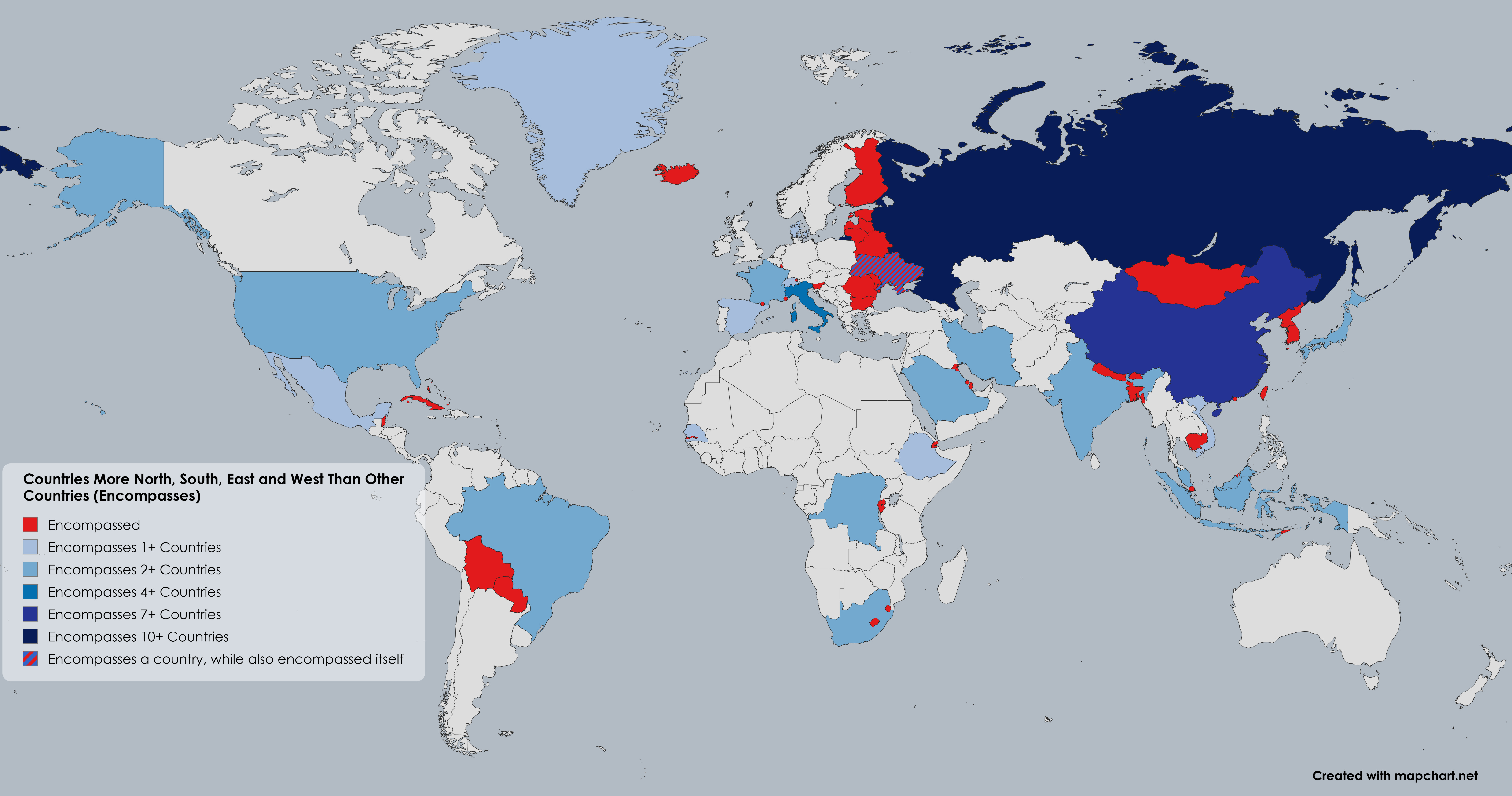 Son en total diez los países encerrados cardinalmente por Rusia, aunque posiblemente no están entre ellos los que intuitivamente hubieras imaginado. Por muy pocos kilómetros, tanto Georgia como Kazajistán consiguen llegar más al sur de lo que llega Rusia, con lo que no se encuentra en la lista ningún país del Cáucaso ni de Asia Central. Pero lo que a mí me parece más curioso es que, si no fuera por el exclave de Kaliningrado, nueve de los diez países que están encerrados cardinalmente por Rusia no lo estarían: Finlandia, Estonia, Letonia, Lituania, Bielorrusia, Ucrania, Moldavia, Rumanía y Bulgaria. Dicho de otro modo, si Kaliningrado no fuera parte de Rusia, Rusia únicamente conseguiría encerrar a Mongolia, a pesar de ser el país más grande del mundo.