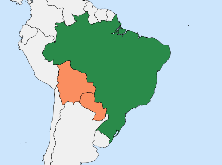 Tal y como se puede ver en el mapa, Brasil está claramente más al norte y al este que Bolivia y Paraguay, pero también está situado más al oeste y al sur que ambos países. Con esto podemos decir que Bolivia y Paraguay están encerrados cardinalmente por Brasil.