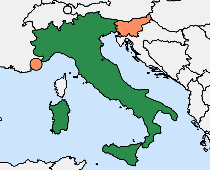 Ya hemos visto antes que San Marino y Ciudad del Vaticano están totalmente rodeados de Italia, pero hay dos países más que cardinalmente se encuentran encerrados por Italia. Eslovenia, que podría parecer que está claramente más al este, no llega a un punto tan extremo como Apulia, el tacón de la bota italiana. Pero casi más llamativo es el caso de Mónaco, que a pesar de no compartir frontera con Italia, no está tan al oeste como la parte más occidental de Italia, la cumbre de Rocca Bernauda, en los Alpes.
