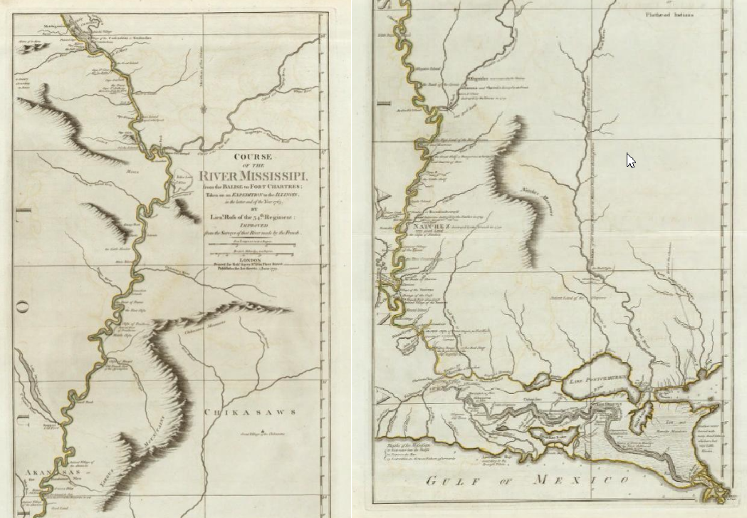 El Mississippi, al ser el río más importante de Norteamérica, no sorprende que lleve siglos dibujado sobre el papel. Hay registros cartográficos franceses desde el siglo XVII, aunque hasta 1765 nadie se había tomado el esfuerzo de recorrerlo y confirmar su trazado al detalle. El teniente británico John Ross lo hizo junto a una expedición militar, y publicó el resultado en su mapa de 1775. Se trata del primer mapa del Mississippi basado en la observación directa, pero con el mismo problema que los anteriores: capturaba el río en un instante, con un cauce fijo, como si el Mississippi llevara ahí toda la vida. Quieto, inamovible.