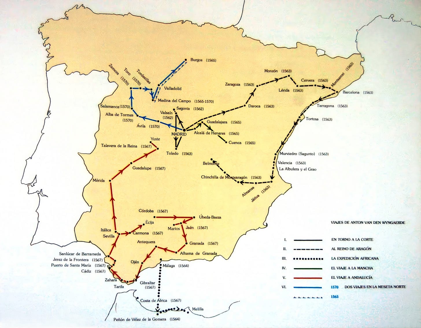 Entre 1562 y 1570, Wyngaerde realizó varias expediciones en torno a la corte, y al menos seis viajes por la península: al reino de Aragón (1563), a África (1564), a La Mancha (1565), a la Meseta Norte (1565), a Andalucía (1567), y de nuevo a la Meseta Norte (1570). De esos viajes, se han conservado los retratos a vista de pájaro5 de 62 localidades, cada una con distinto nivel de detalle técnico.