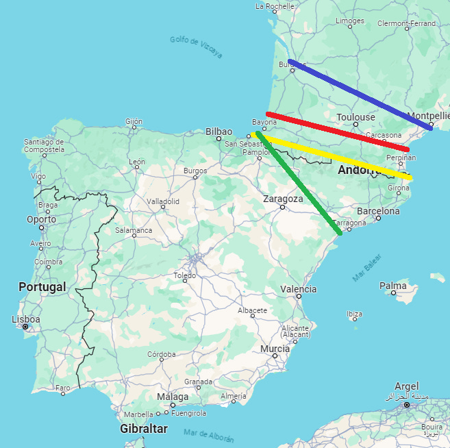 ¿Cuál creéis que es la línea más corta? Con las líneas trazadas seguramente ya sospechéis que la respuesta no son los Pirineos, pero tampoco es la que yo pensaba inicialmente, cuando tanteé el problema por la primera vez, tuvieron que corregirme el pasado sábado. Esta es la longitud de cada una de esas líneas: