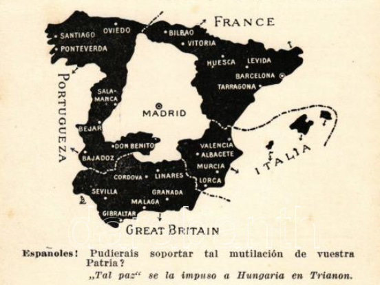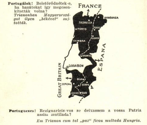 Pero sin duda, la propaganda más interesante que publicó la Liga Revisionista Húngara llegó mucho más allá de las fronteras de Hungría. Para que otros países fueran conscientes de la magnitud de la amputación de Hungría, se crearon mapas que equiparaban las cesiones forzadas de Hungría a todos esos países del mundo donde se publicó el mapa, tomando el Tratado de Trianon como referencia.