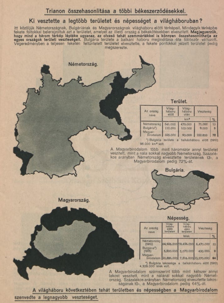 Esta página se centra en lo desequilibrados que fueron los pactos de postguerra y cómo afectaron mucho más a Hungría que a cualquier otra nación derrotada. La comparativa excluye deliberadamente al Imperio Otomano y a Austria, que sí que sufrieron importantes pérdidas, pero incluye a Alemania y Bulgaria, cuyas pérdidas territoriales fueron mínimas.