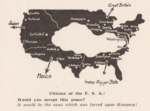 Un ejemplo, este nuevo mapa étnico en el que se muestra cómo los territorios cedidos no tenían una clara mayoría de población de las naciones de las que habían pasado a formar parte, lo cual no era cierto6. Por supuesto, el mapa obvia por completo que los húngaros, en todos esos casos, eran un porcentaje menor que rumanos, eslovacos, serbios y croatas en sus respectivas regiones.