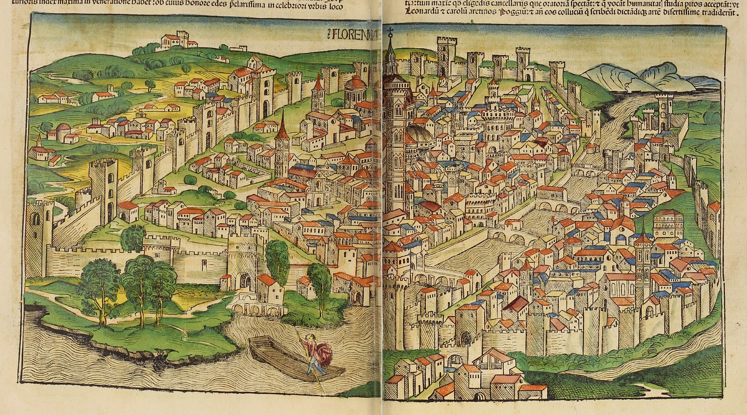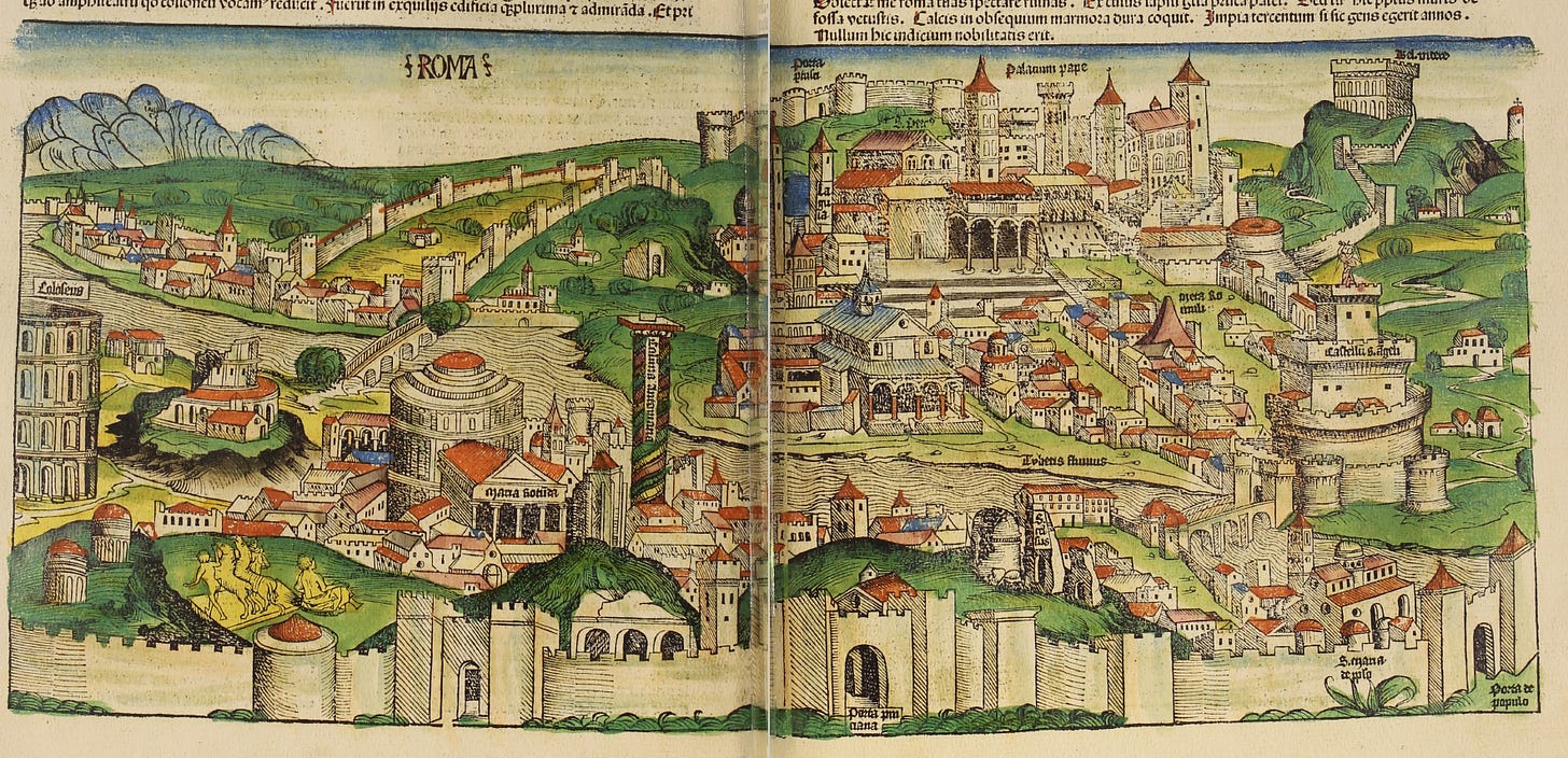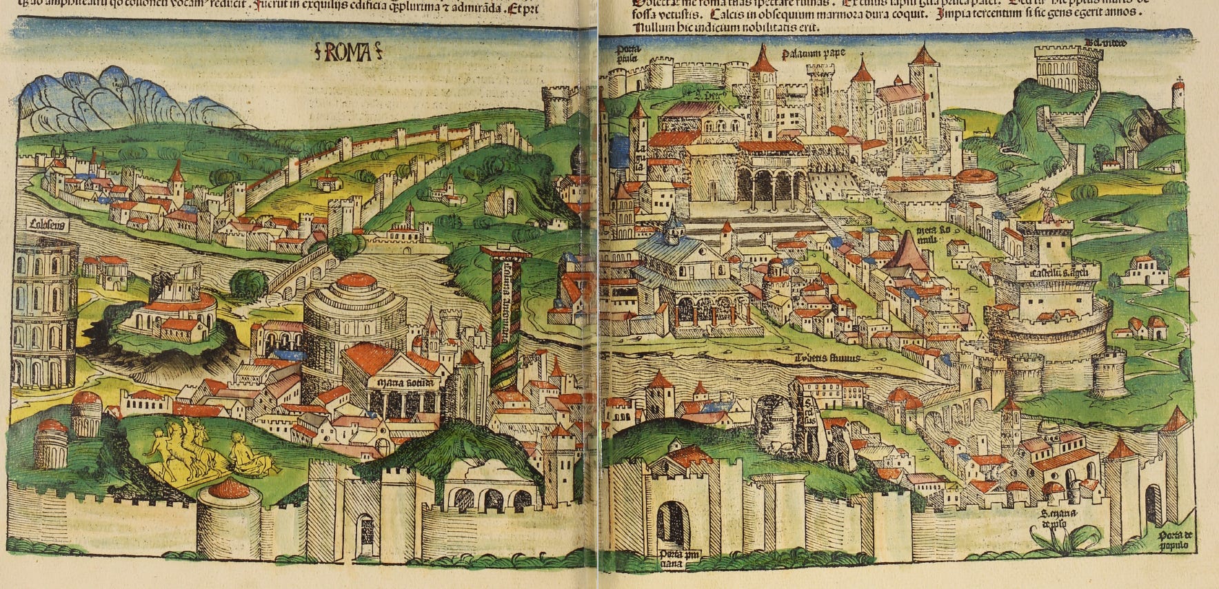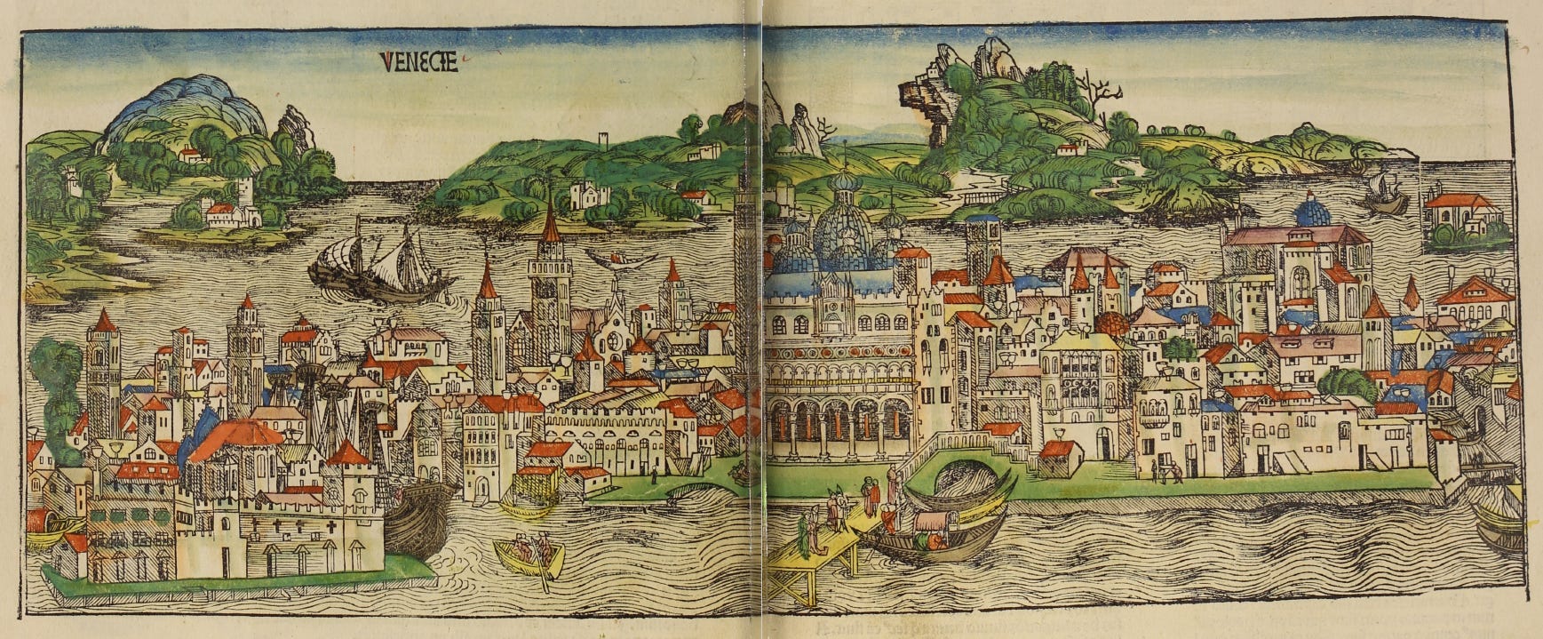 Entre los mapas, en su sentido más amplio, destacan especialmente las representaciones de ciudades de Europa y Oriente Medio. A finales del siglo XV, el arte no había encontrado especial interés en las ciudades. Es cierto que se pueden encontrar algunas representaciones en manuscritos medievales, pero en su gran mayoría distaban mucho de ser una representación fiel de la ciudad y se limitaban a idealizaciones centradas en características reconocibles.