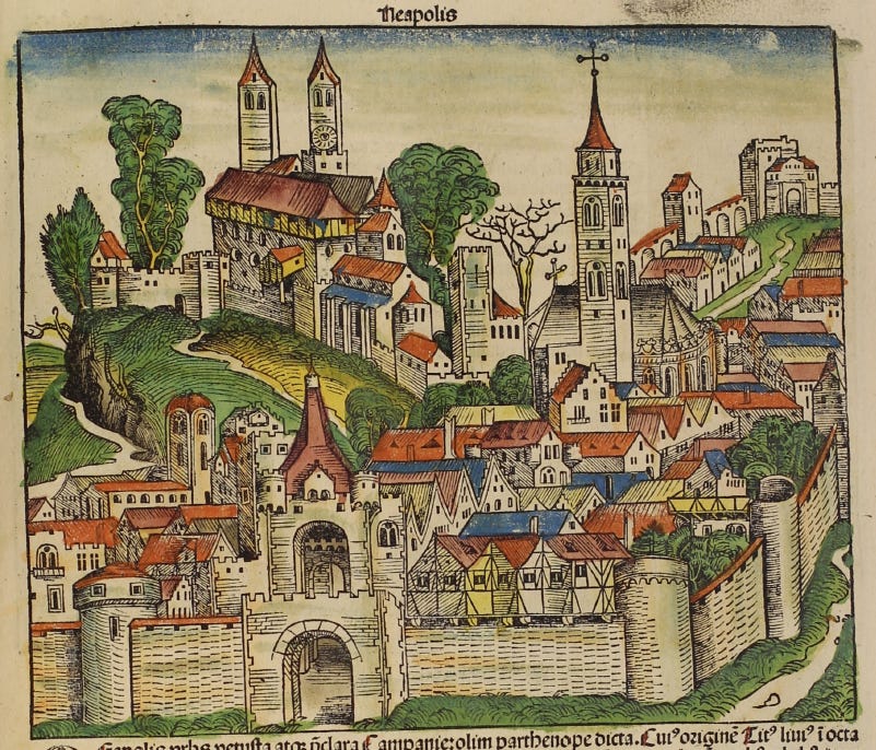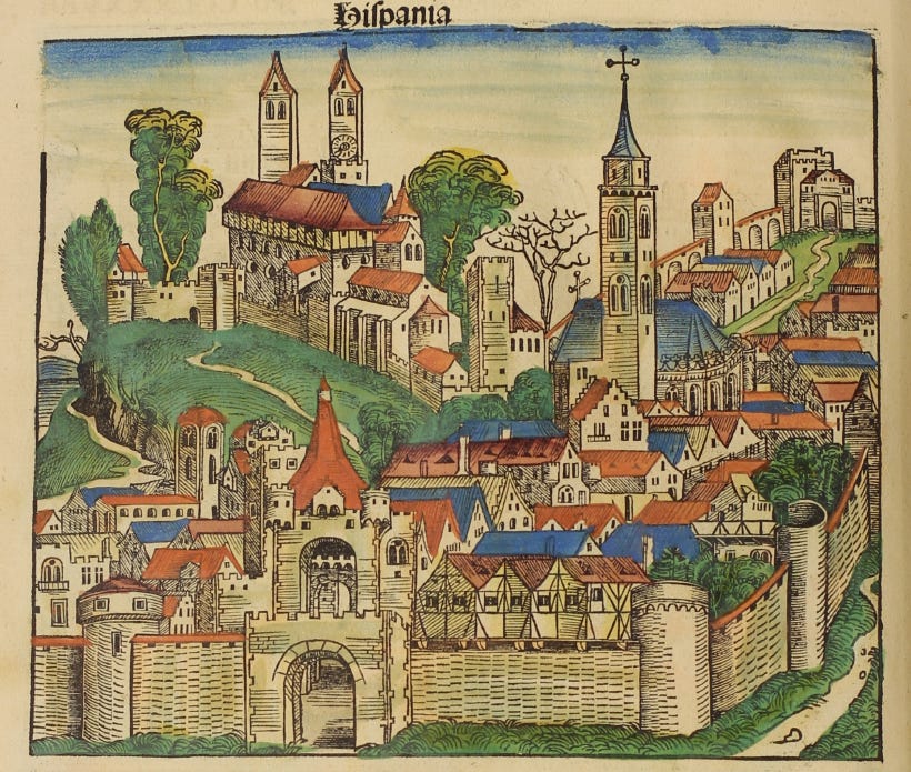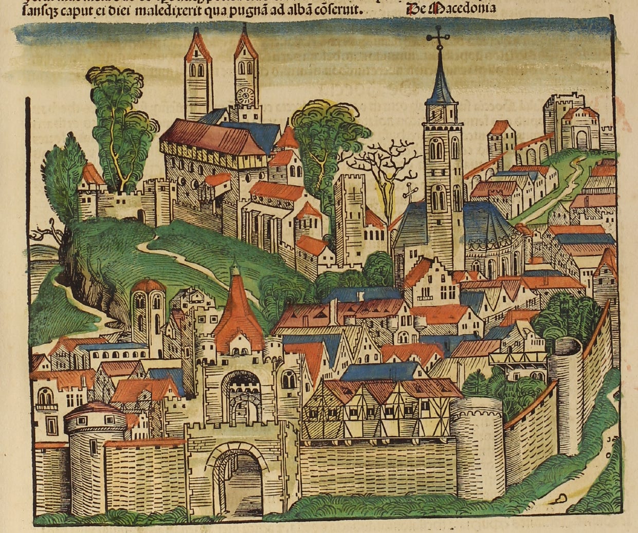 Con esto en cuenta, no debe sorprender que muchas de las ciudades que aparecen en las Crónicas de Núremberg sean ideas genéricas de una ciudad medieval alemana, sin ningún rasgo que permita inequívocamente identificar ciudades concretas. De hecho, muchas de las planchas genéricas se utilizaron para representar ciudades con las que el autor no estaba familiarizado, como estos tres casos que os dejo más abajo.