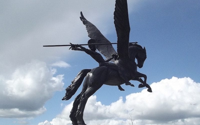 Belerofonte fue un héroe de la mitología griega que, entre otras hazañas, consiguió matar a la Quimera y cabalgar a Pegaso. Su estatua en Esmirna7 se convirtió en la maravilla que sustituyó al Zeus de Olimpia en las listas de maravillas cuando se impuso el cristianismo en el Imperio Romano. Con esto, no solo se erradicaba el paganismo de las listas de maravillas, sino que también se incluía una referencia que podía relacionarse fácilmente con guerreros cristianos como San Jorge.