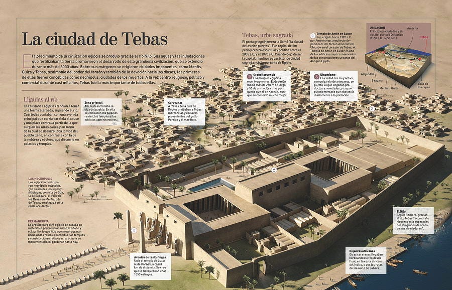 En la actualidad, cualquiera que viaje a Egipto, podrá disfrutar del templo de Luxor, que se muestra en la imagen de más arriba; el templo de Karnak, con 134 columnas y múltiples obeliscos; así como la avenida de las esfinges, con más de mil esfinges a lo largo de tres kilómetros, que conecta el templo de Luxor y el templo de Karnak. Tuve la suerte de poder visitarlo hace unos años y confirmo que es uno de los lugares más increíbles en los que he estado. Y a pesar de la grandeza de sus ruinas, lo que vemos en la actualidad es tan solo una pequeña parte de lo que fue en su momento álgido.
