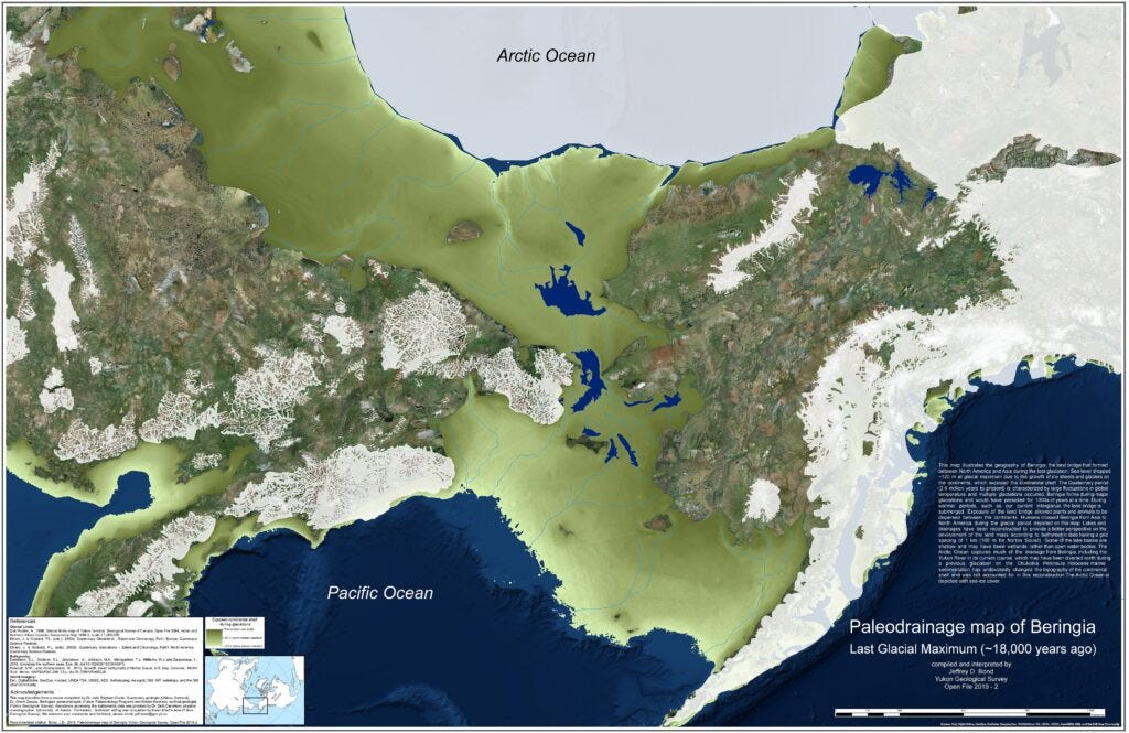 La temperatura en Beringia fue inusualmente cálida. Se estima que podía alcanzar hasta los 10 °C durante el verano, gracias a lo cual se pudo mantener libre de hielo, a diferencia de Canadá y el océano Ártico. Esto hizo que este puente fuera apto para su tránsito al menos durante dos periodos, el último entre 25 000 y 10 000 años a. C. ¿Y sabéis qué ocurrió precisamente durante ese periodo? Que el ser humano cruzó desde Chukotka2 a Alaska, llegando por primera vez a América. Precisamente caminando sobre el puente de Beringia.