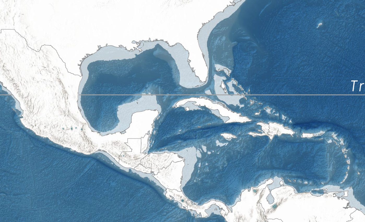 El Caribe y América Central vieron como su extensión aumentó de forma sustancial. Las penínsulas de Yucatán y Florida aumentaron significativamente su tamaño, reduciendo notablemente la extensión del golfo de México. Los golfos de Panamá y Venezuela, de menor tamaño, desaparecieron por completo. Pero quizá lo más curioso es como Bahamas se convirtió en la segunda isla del Caribe en extensión, por debajo de Cuba y por encima de la Española.