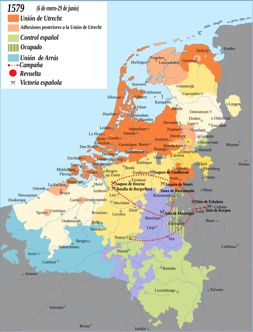 La Guerra de los Ochenta años levantó a las Diecisiete Provincias contra el Imperio español. El conflicto se alargó, con tratados y treguas entre medias, hasta 1648. En 1579, las provincias del norte firmaron el Tratado de Utrecht, con el que formaron una alianza defensiva que ayudó a incrementar la cohesión. Dos años más tarde, en 1581, esa federación proclamó su independencia como la República de las Siete Provincias Unidas, mientras que el sur se quedó bajo dominio español.