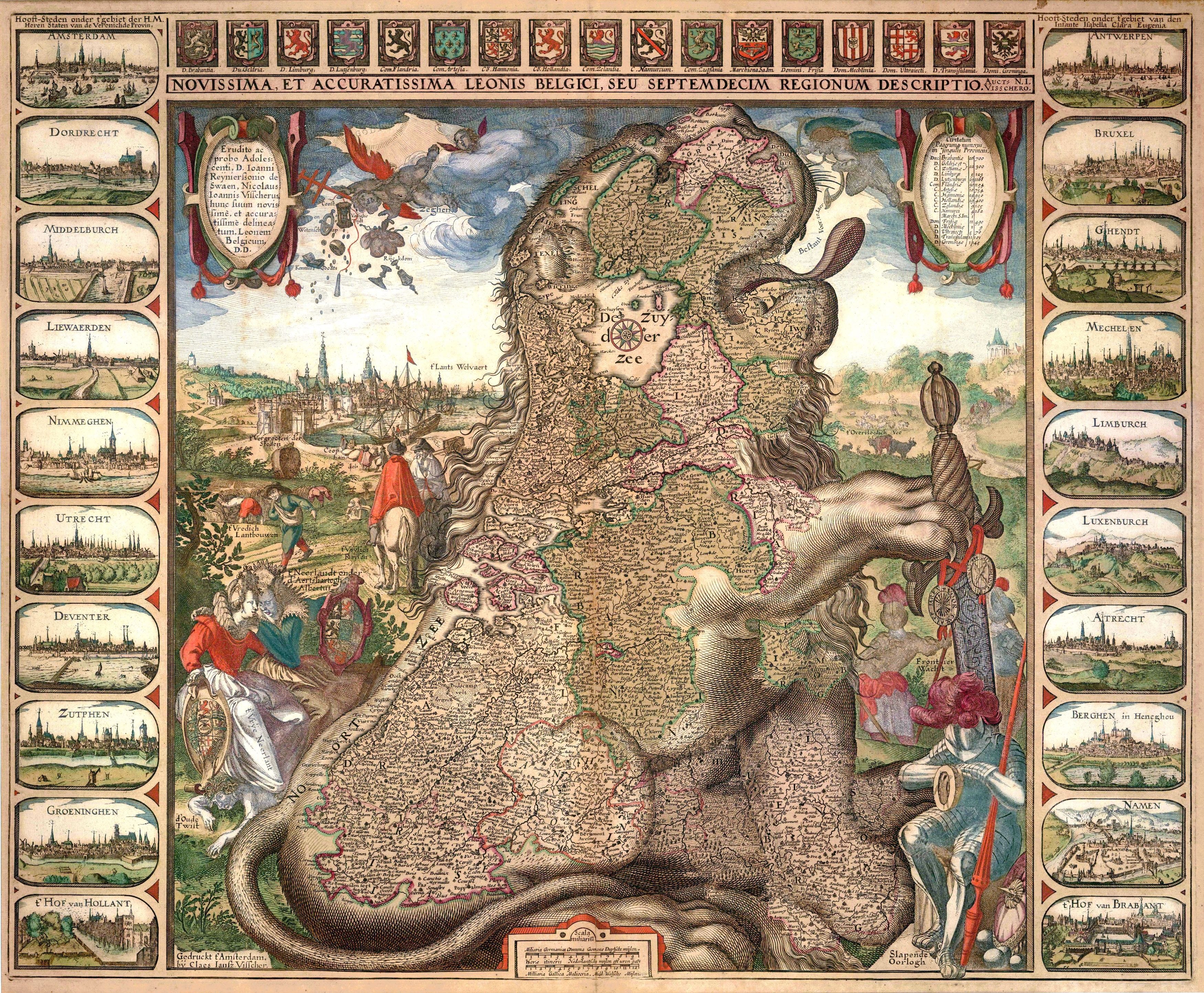 Pieter van den Keere también publicó una interesante versión del Leo Belgicus en 1617, como parte de su obra Germania Inferior, el primer atlas dedicado íntegramente a un país4. Una importante diferencia de van den Keere frente a Visscher o Hondius es que este sí que fue lo suficientemente escrupuloso como para atribuir la idea a Michaël Eytzinger en el reverso del mapa por haber sido el primero en representarlo.