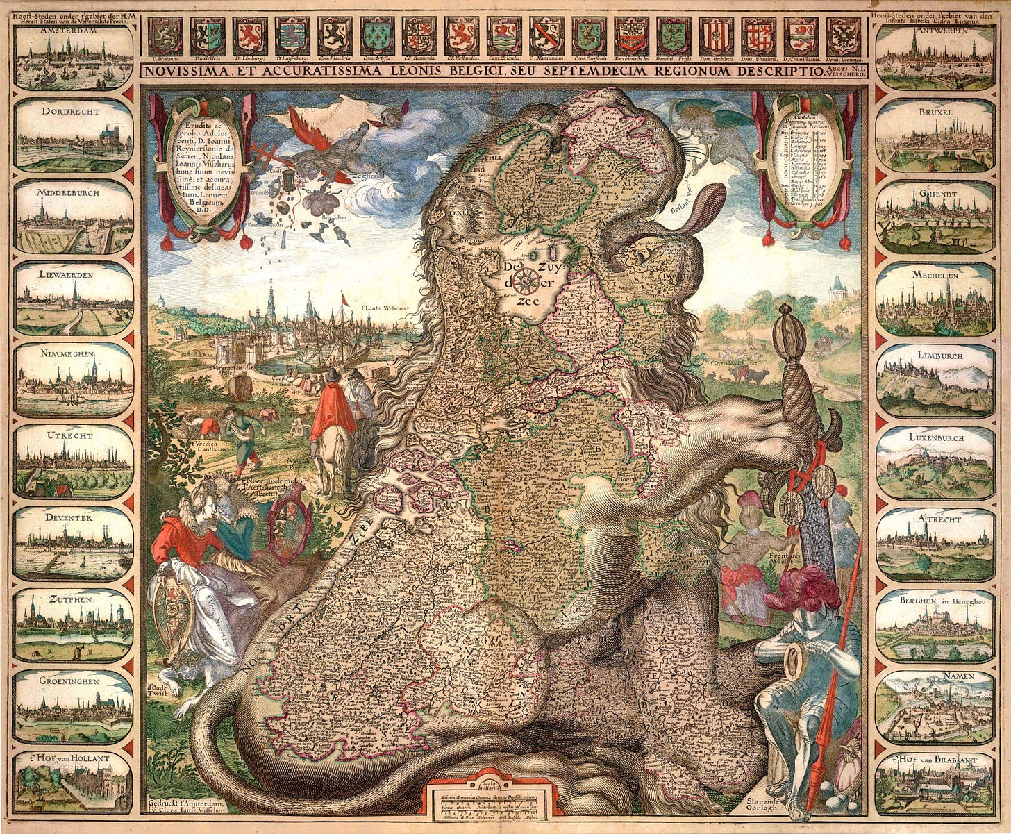 Una de las versiones más famosas fue la de Claes Janszoon Visscher, publicada poco después de 1609, cuando se firmó la Tregua de los Doce Años, un armisticio negociado con España. En este mapa, el león lleva una espada enfundada y mirando hacia abajo, lo que hace referencia directa a la tregua. Alrededor de la figura del león aparecen escenas pastorales que ahondan en esa idea de paz que puede garantizar la prosperidad. Encima de la cola del león, dos mujeres representan a las provincias del norte y del sur sobre un anciano sometido con el nombre d’Oude Twist3. En conjunto, es un perfecto ejemplo de propaganda de la paz.