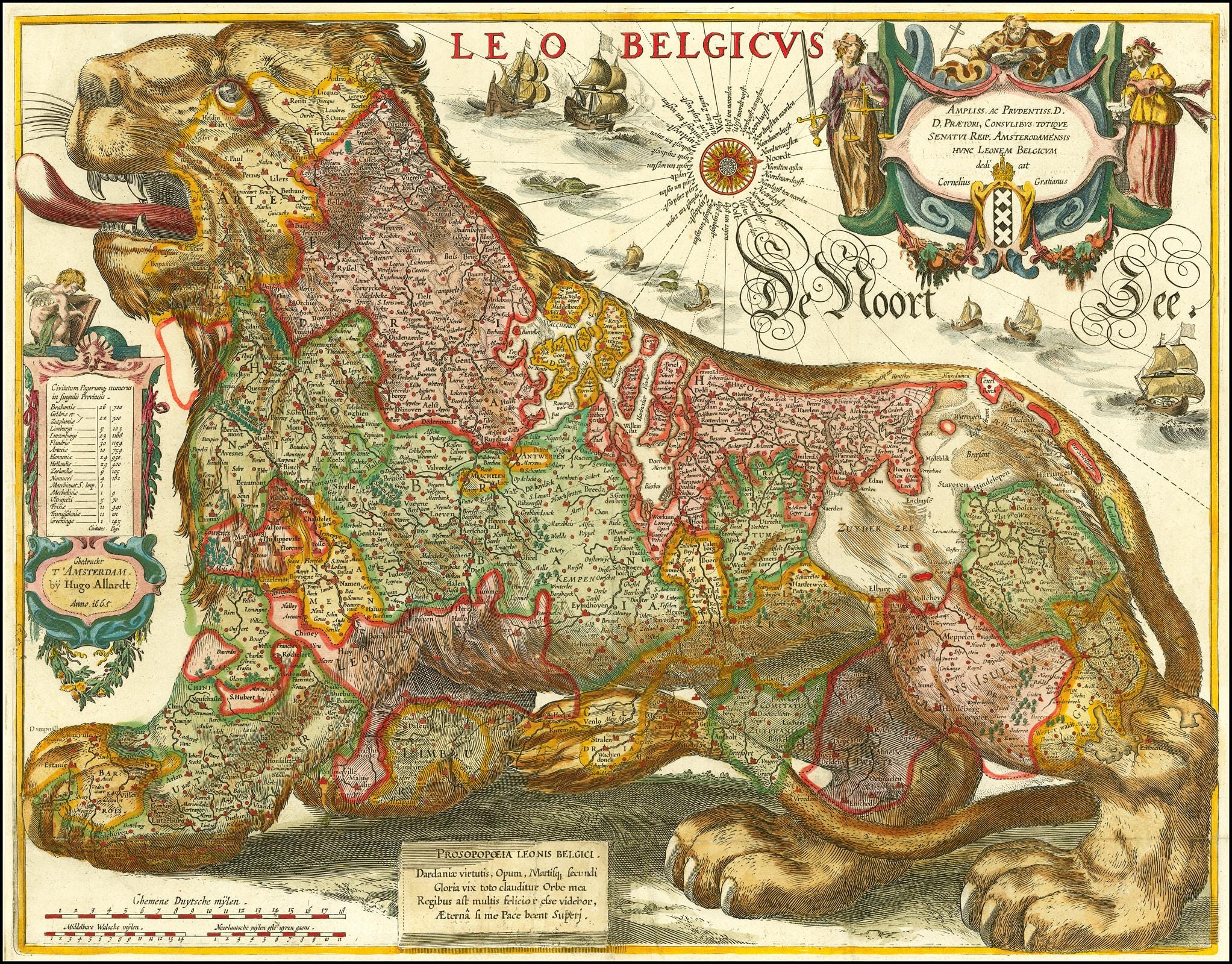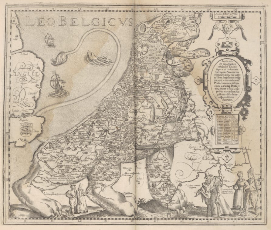 El Leo Belgicus es una de las ideas cartográficas más reconocibles y repetidas de los siglos XVI y XVII. Es exactamente lo mismo que parece: un mapa del Benelux, el territorio que actualmente conforman Países Bajos, Bélgica y Luxemburgo, con forma de la silueta de un león. El Leo Belgicus no inventó la cartografía figurativa y antropomorfa; ese mérito quizá sea para la Europa Regina. Pero el Leo Belgicus sí que tiene tras de sí una historia mucho más rica, al nacer en Colonia, por iniciativa de un austriaco, para apoyar en la guerra contra el Imperio español. ¿Y dónde está la nación y el nacionalismo de los que hablaba al comienzo? Pues que este mapa lleva el nombre de un país que nacería 250 años más tarde.