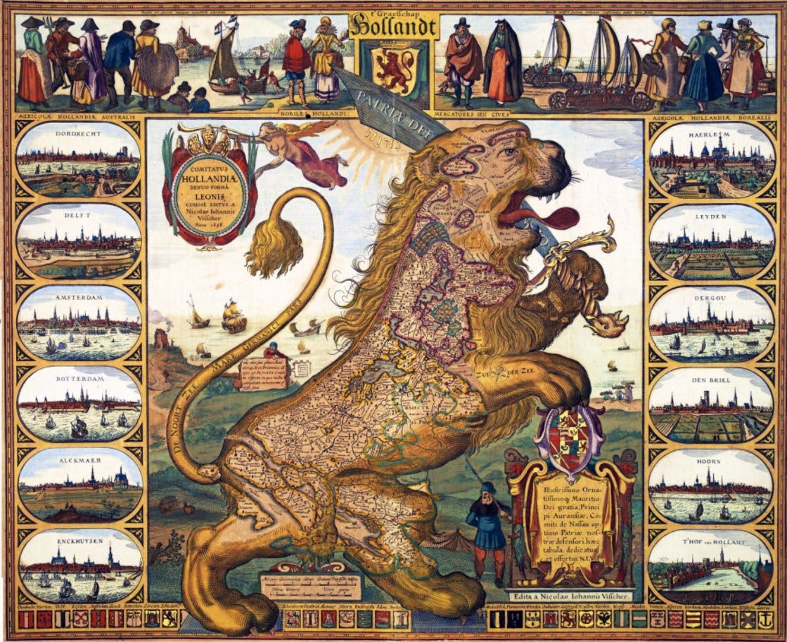 Nicolaus Johannis Visscher, hijo de Claes, decidió celebrar esta independencia con un nuevo león. Un león que volvía a estar erguido, con la espada en alto, pero que ahora únicamente contenía la provincia de Holanda. El Leo Belgicus se había convertido en el Leo Hollandicus.