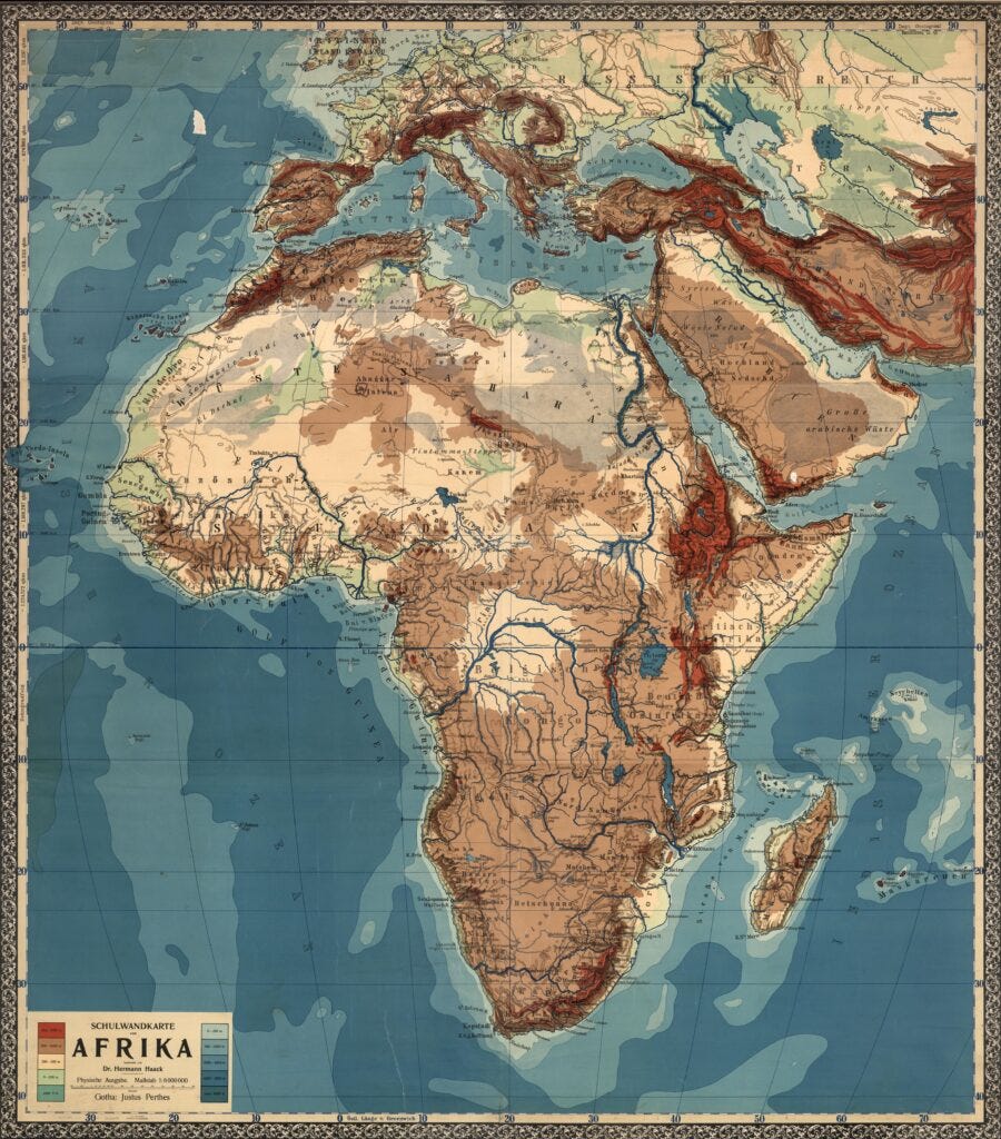 Para finalizar, os dejo con una preciosidad de mapa físico de África, publicado por el cartógrafo alemán Hermann Haack en 1900, que ya incorporaba casi todos los estándares de color que hemos visto hoy8.