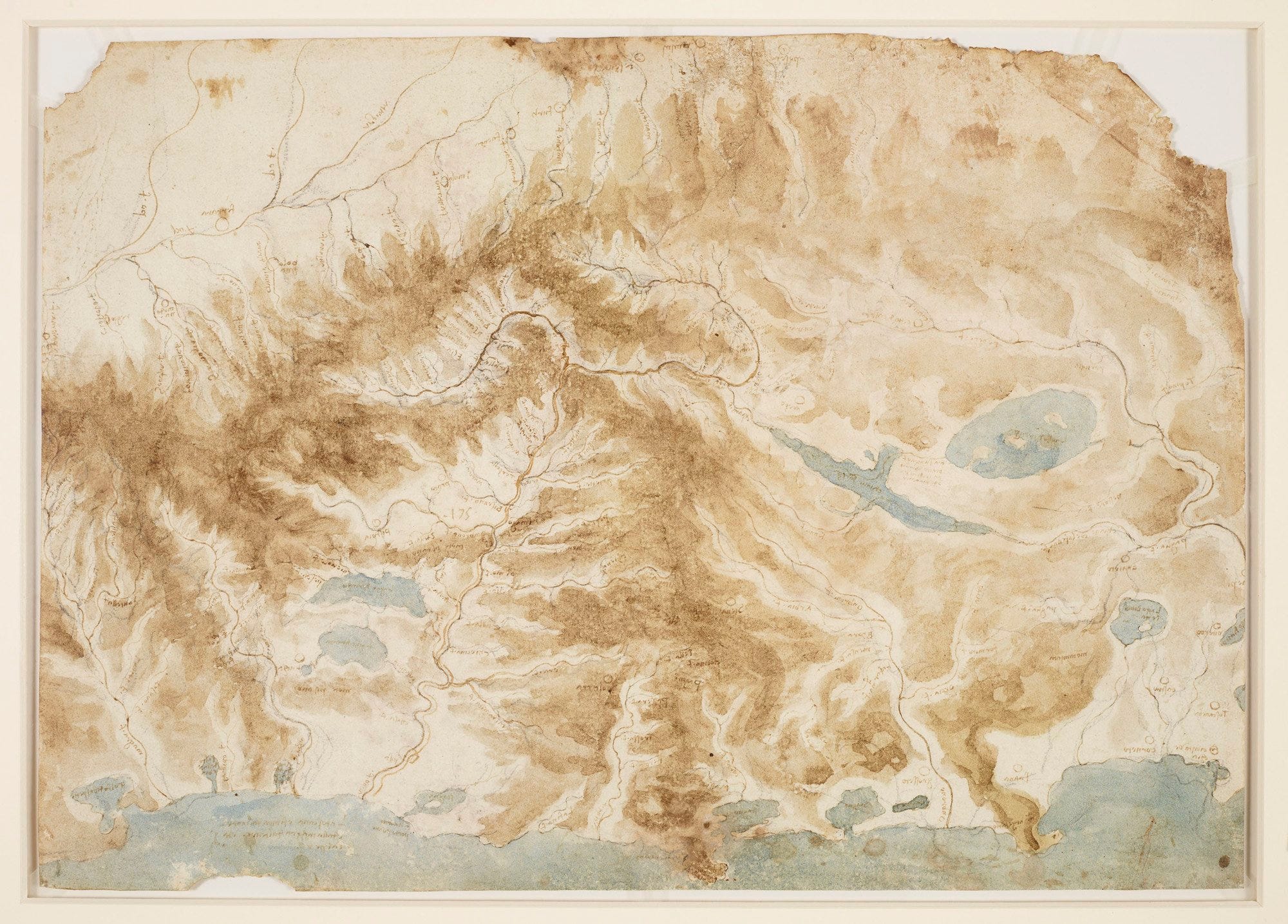 Este mapa es una auténtica maravilla. Lo realizó Leonardo da Vinci en 1502, tomando como referencia la información topográfica que recopiló para un trabajo encargado por César Borgia3. Toda esa información la plasmó en este mapa de la costa occidental del centro de Italia4, centrado en el valle del río Arno, el cual atraviesa a Pisa y su ciudad natal, Florencia. Además, en el mapa se puede apreciar parte del río Po en la izquierda y el río Tíber en la derecha.
