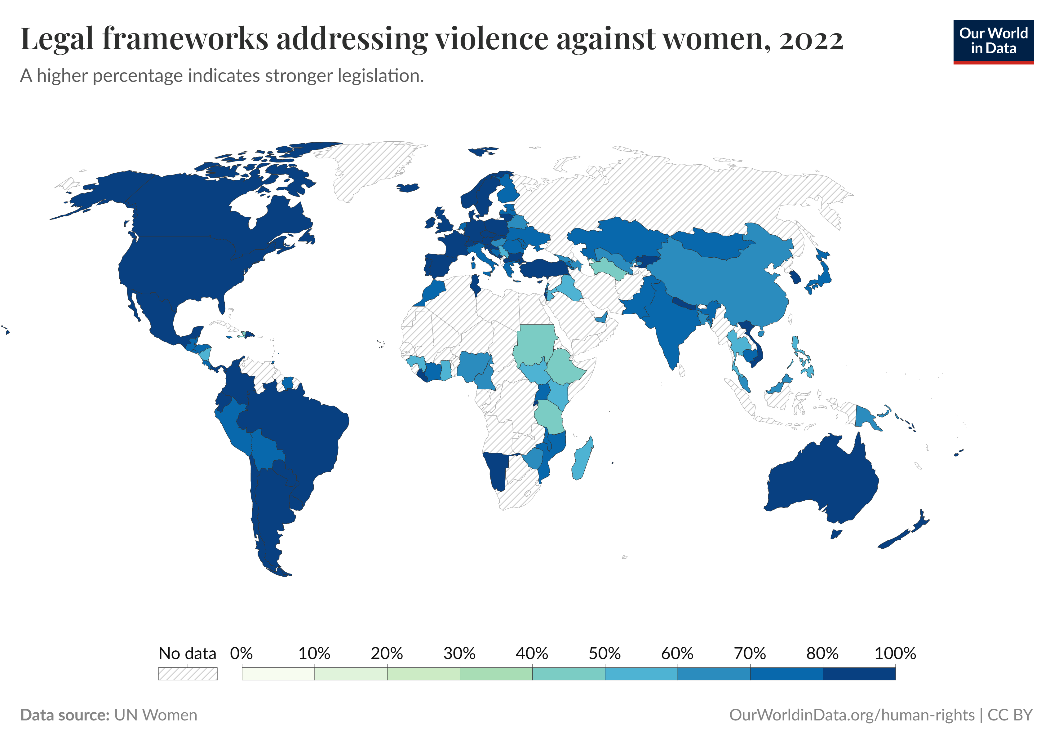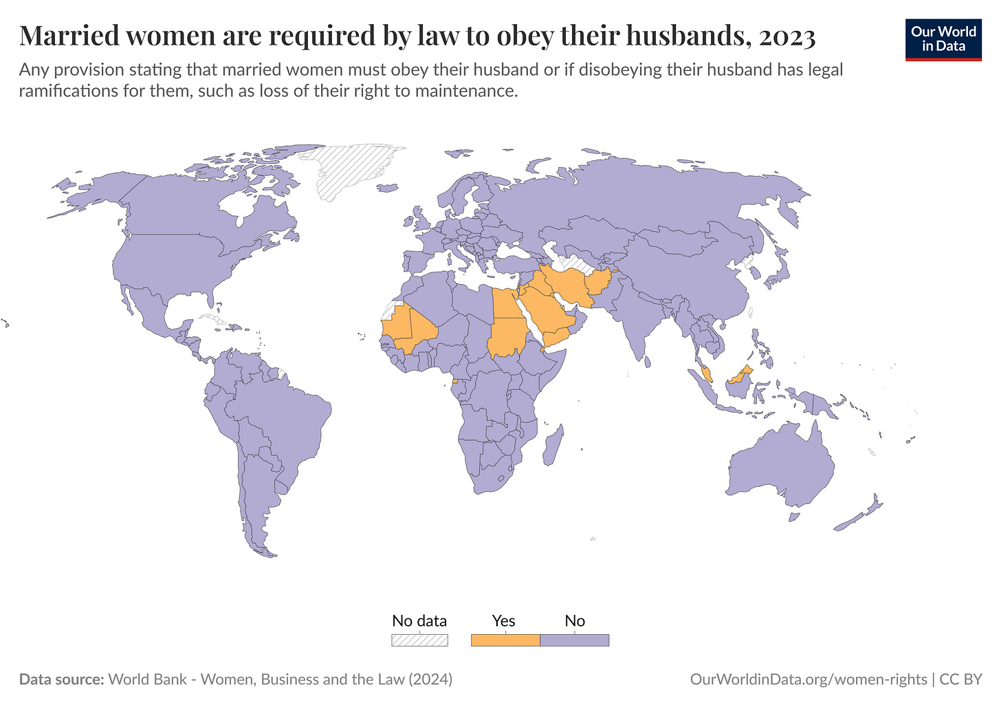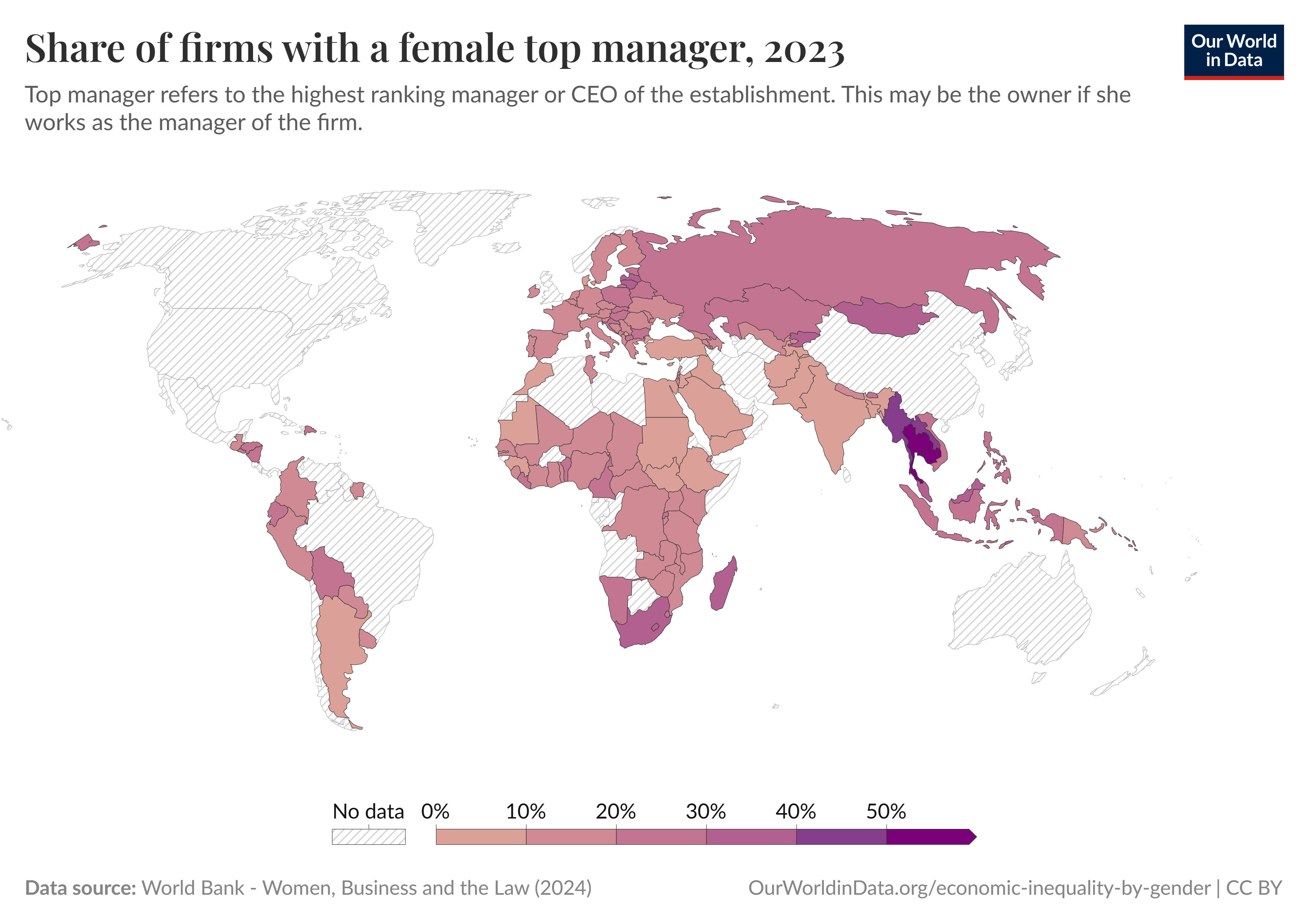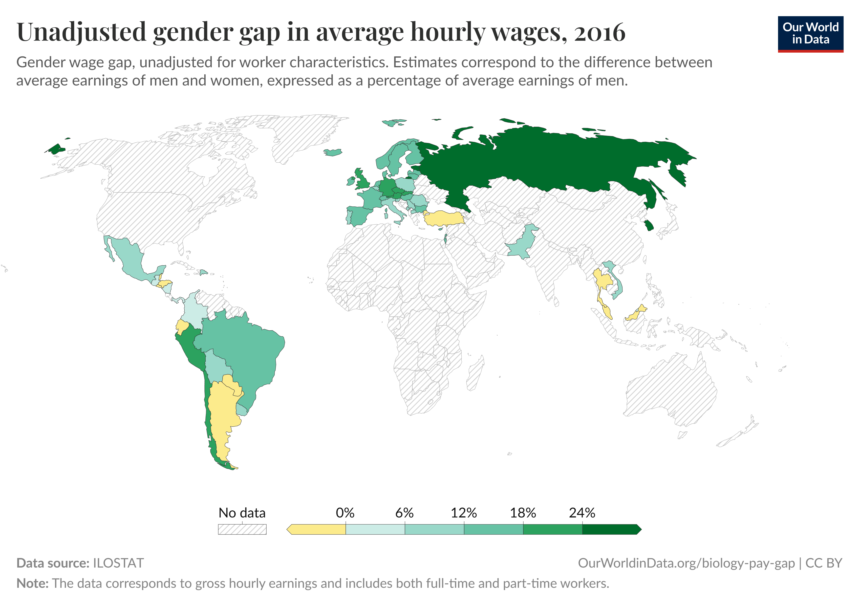 El pasado sábado 8 de marzo, como cada año, se celebró el Día Internacional de la Mujer. A pesar de todos los avances que ha logrado la lucha feminista en el último siglo y medio1, aún queda mucho camino por andar. Este mapa con datos del Banco Mundial es una buena muestra, a alto nivel, de la gran desigualdad que aún existe en algunas regiones del mundo.