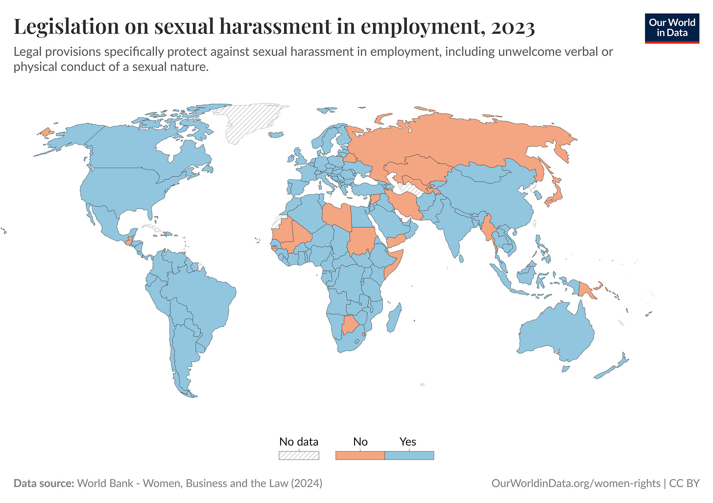 La situación de protección contra el acoso sexual en el trabajo, a priori, es ligeramente mejor. En gran parte del mundo existe un marco legal que hace estos comportamientos punibles. Por supuesto, la existencia de esta legislación no garantiza que esa seguridad en el entorno laboral exista en todos los casos.