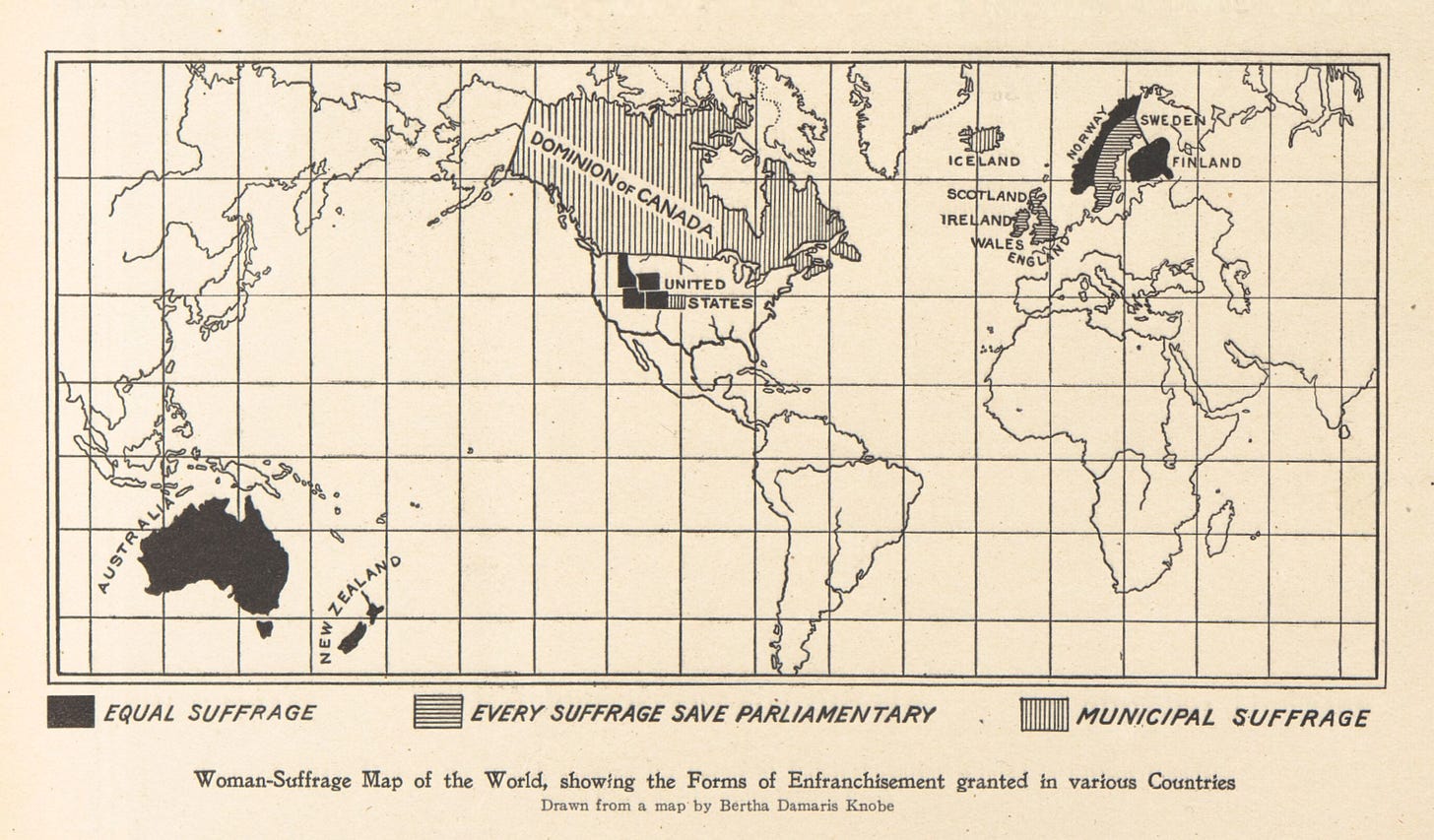 Este mapa forma parte de un artículo que publicó Bertha Damaris Knobe en 1908 analizando la importancia del voto femenino para el conjunto de la sociedad. Se muestra la desoladora situación en prácticamente todos los rincones del mundo, ya que en 1908 aún muy pocos países habían logrado avances significativos.