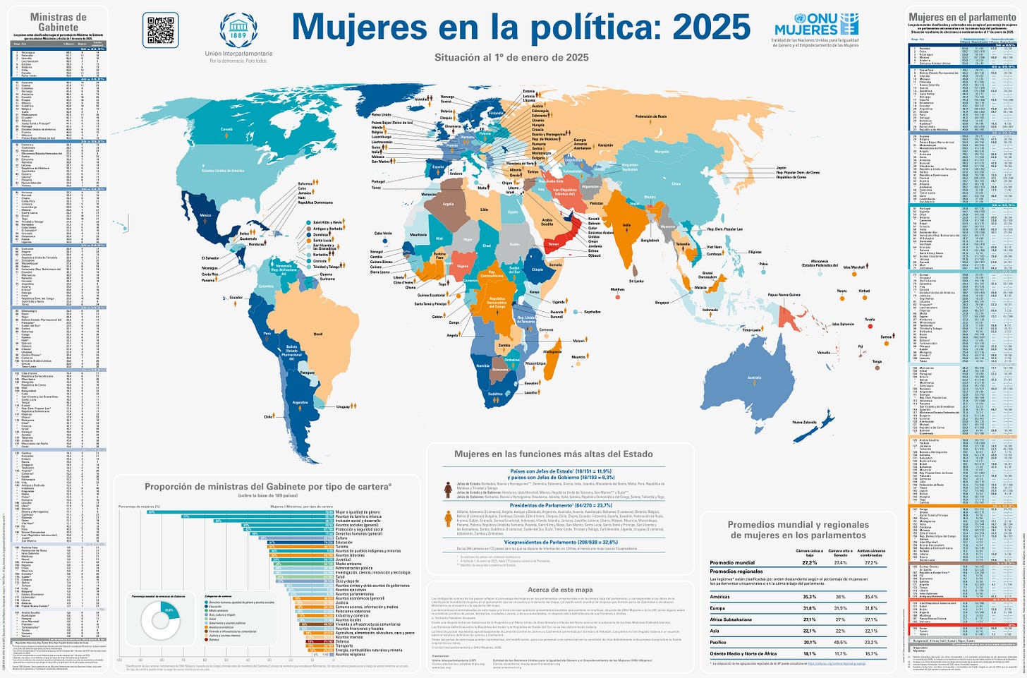 Cada año, la Unión Interparlamentaria y la ONU Mujeres presentan un informe con datos actualizados sobre mujeres en la política a nivel mundial. Este mapa muestra la situación de puestos parlamentarios, de ministros y también aporta detalles sobre qué tipo de ministerios ocupan las mujeres en el mundo.