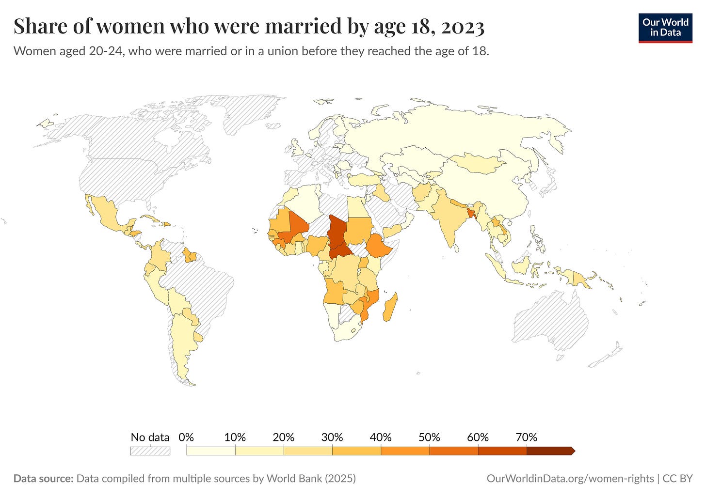 Algunas de las cifras que se ven en este mapa son realmente alarmantes. Tanto Chad como la República Centroafricana, según datos de 2019, superan el 60 % de mujeres entre 20 y 24 años que ya estaban casadas a los 18 años. La cifra supera el 20 % en gran parte de África y parte del sur de Asia.