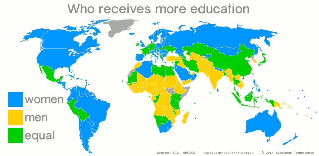 En el mapa se muestra en azul todos los países donde las mujeres dedican más años a la educación, en amarillo donde lo hacen los hombres y en verde donde es equiparable. Se deja de ver un patrón interesante: en los países con una mejor situación económica e históricamente democráticos, las mujeres dedican más tiempo a la educación.