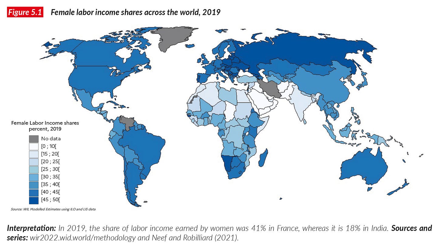 Este otro mapa muestra el porcentaje de los ingresos totales por trabajo de cada país que corresponde a mujeres. Como tal, el mapa combina la participación de la mujer en el mercado laboral con la brecha salarial existente. Este mapa, sin aportar directamente los datos, ayuda a ver que en países como la India, a pesar de que la mujer ocupa el 33 % de los puestos de trabajo, ni siquiera llega al 20 % de los ingresos generados. Dicho de otro modo, una mujer en la India cobra prácticamente la mitad que un hombre.