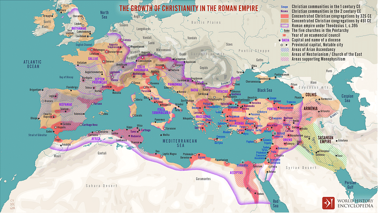 En las décadas posteriores a la proclamación del Imperio Romano, en la región de Judea surgió el cristianismo. Lo que comenzó como una pequeña secta dentro del judaísmo, con el paso de los siglos fue ganando adeptos por todos los rincones del Imperio.