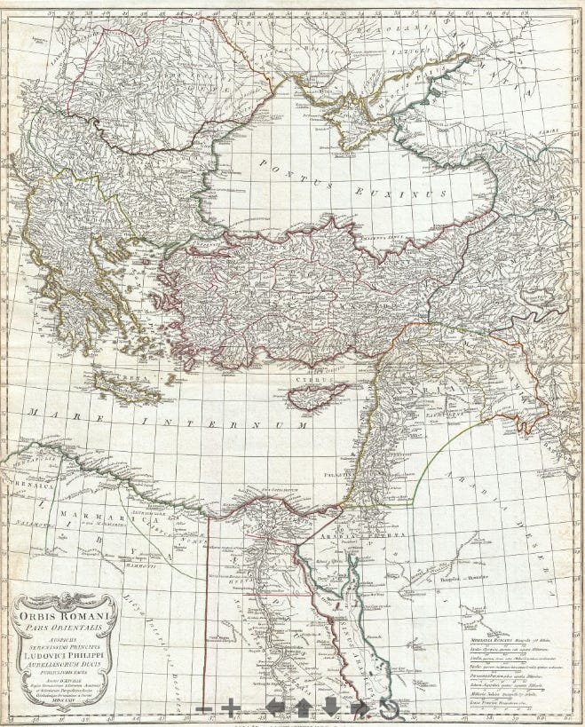 Sea como fuere, a todo aquello le dediqué un artículo en el que se incluía una encuesta. De todos los que respondieron, únicamente un 10 % dijo no pensar jamás en el Imperio Romano. Se ve que hay cierto sesgo entre la gente que se pasa por aquí. Yo todas las semanas veo varias veces un acueducto romano de casi dos milenios1, así que es inevitable pensar en ese periodo de forma regular. Pero, aunque viviera en otro lado, soy alguien que piensa y trata con mapas prácticamente todos los días2. Como muchas veces esos mapas tratan sobre el Imperio Romano, es inevitable que también sea algo con lo que me tope de forma habitual.