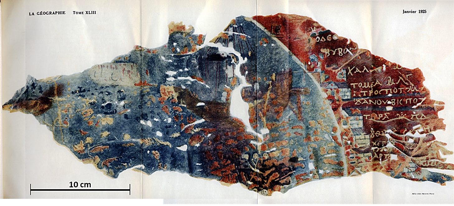 Este mapa que veis más arriba se encontró en la ciudad de Dura Europos, en la actual Siria. Está dibujado sobre el cuero que cubría el escudo de un soldado romano y se trata de uno de los pocos ejemplos de cartografía militar romana. A priori no tendría por qué ser importante, de no ser porque es una muestra de que el ejército romano no solo utilizaba itinerarios escritos, sino también documentos gráficos en forma de mapas que les ayudaban a desplazarse y cumplir las misiones.