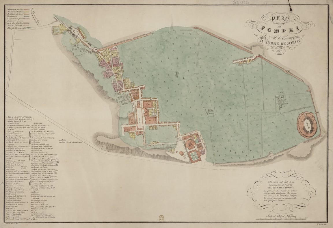 Otro ejemplo de mapa antiguo tratando el Imperio Romano es este de la ciudad de Pompeya. Lo dibujó en 1825 Andrea de Jorio y se trata de uno de los primeros intentos de mostrar la organización de Pompeya de forma visual. Pompeya apenas se había comenzado a excavar, y aún había muy poca información disponible, lo que no privó a de Jorio de publicar lo que se sabía hasta el momento.