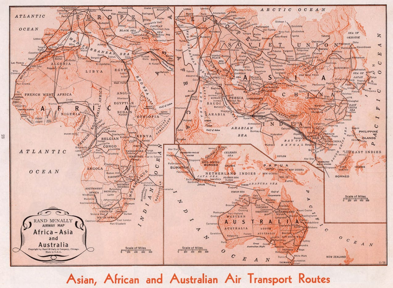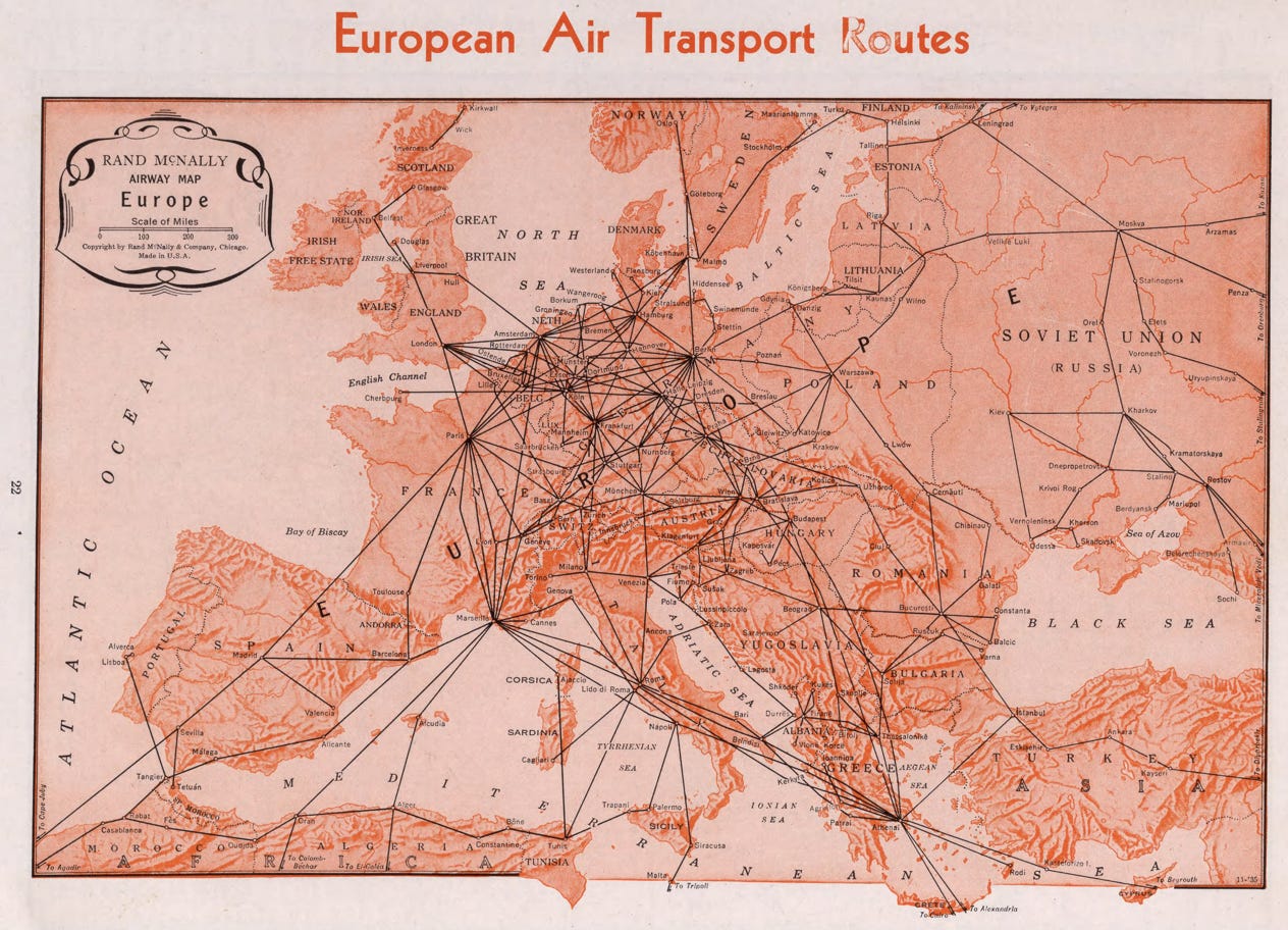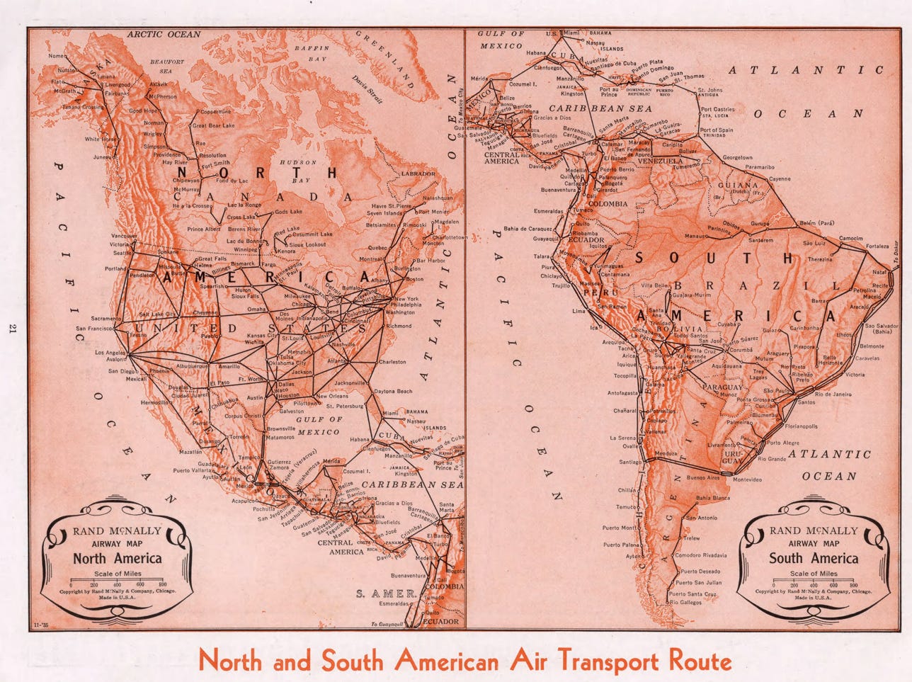 Este atlas, publicado por Rand McNally en 1935, es uno de los primeros ejemplos de mapas de rutas aéreas que existe. Sí que hay otros ejemplos anteriores, pero ninguno de ellos cubre de forma tan eficaz las conexiones que existían en 1935 en el mundo entero.