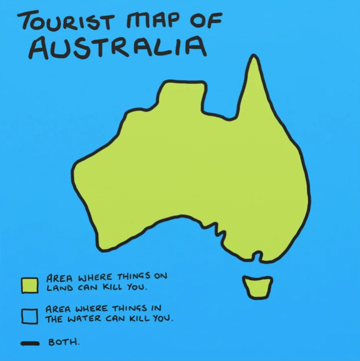 Australia es un país peligroso, MUY peligroso. Tanto, que se puede plantear un mapa turístico simplificado que divida todo el territorio en dos: donde te pueden matar cosas en tierra firme o en el mar.